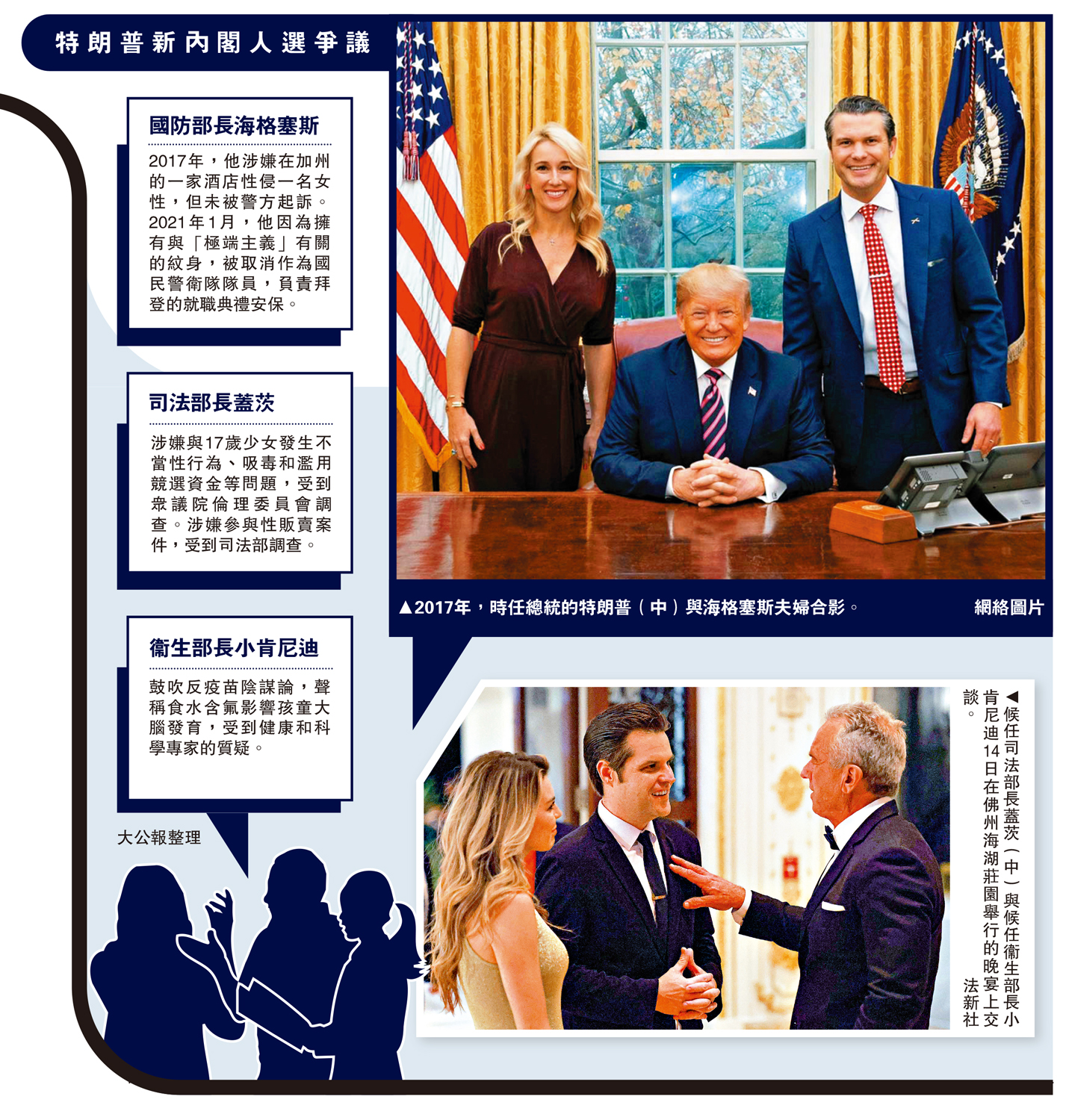 大公報綜合報道,美國候任總統特朗普近日陸續公開內閣提名人選,名單的爭議持續發酵。美媒近日爆料稱,獲特朗普提名出任國防部長的霍士主持人海格塞斯,曾於2017年捲入與性侵有關的指控。這一指控據稱讓特朗普團隊措手不及。此前,獲提名出任司法部長的眾議員蓋茨曾因為性醜聞,受到眾議院道德委員會調查,但共和黨眾議院議長約翰遜卻護短,反對公開報告內容。