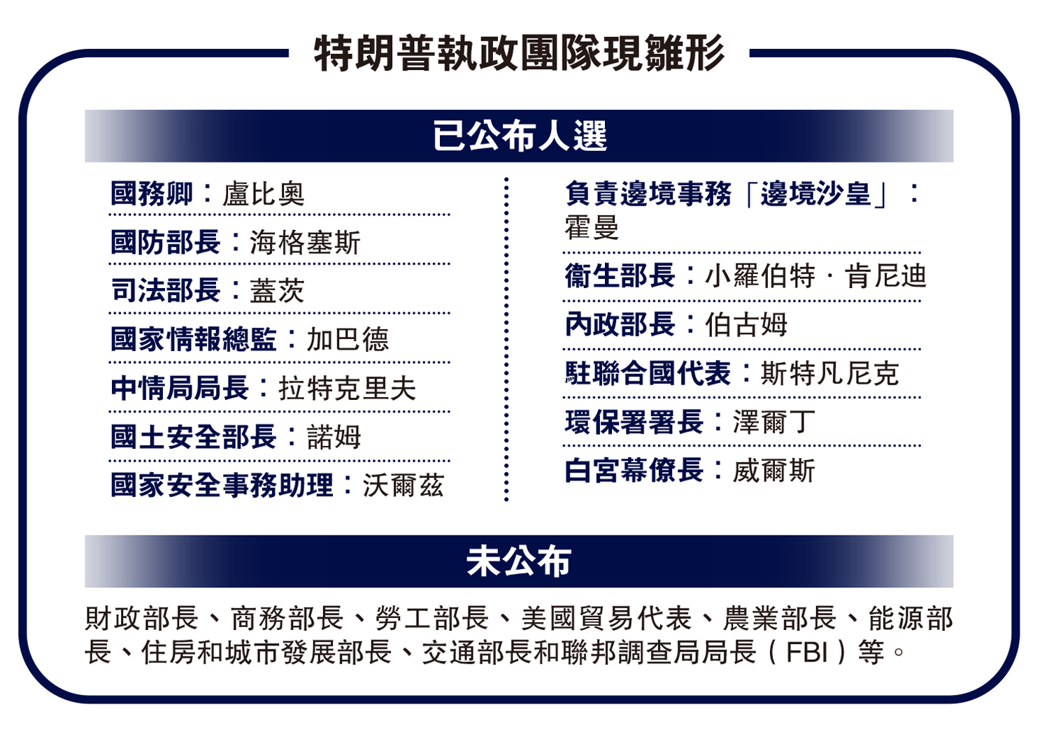 特朗普已要求控制新一屆國會的共和黨參議院,採取「休會任命」的特殊模式,快速通過內閣提名。據稱,對於部分內閣提名人,特朗普過渡團隊也繞過美國聯邦調查局(FBI)的背景審查,採用私人公司進行。