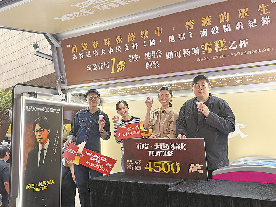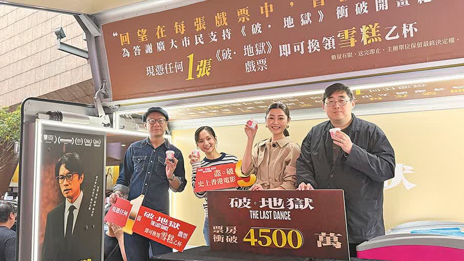 (香港文匯報記者 阿祖)電影《破·地獄》開畫刷新香港電影票房紀錄,至昨日上畫踏入第八天票房數字已衝破4,500萬港元,戲中演員衛詩雅、朱栢康、梁雍婷及導演陳茂賢到旺角鬧市派雪糕,並到戲院繼續謝票,其間吸引大批市民圍觀。