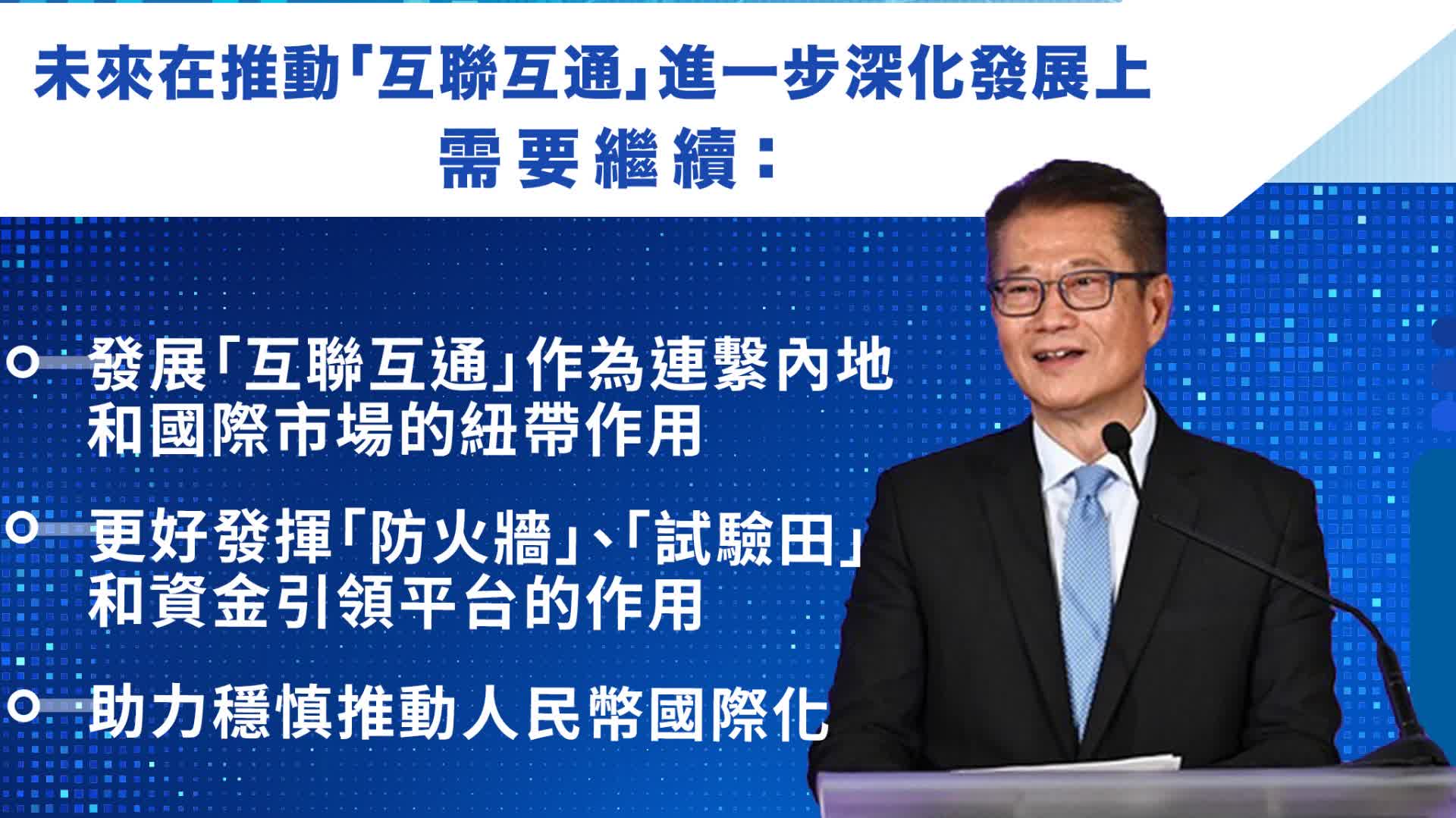 陳茂波提到,十年過去,在股票市場的「互聯互通」方面,合資格股票數目由最初滬港通時候的合共800多隻,增加到現時滬深港通合共超過3,300隻,佔三地市場上市公司總市值的九成。內地投資者南向買賣港股,在今年首三季度的平均每日成交額達380億元,與2014年滬港通開通首月相比,增長了40倍,並佔港股市場成交總額的16.9%。他指,事實上,港股南向通已成為內地公募基金、保險資金和年金基金等長期資金配置境外資產的重要管道,內地投資者通過港股通持有的資產市值已超過3.3萬億港元。