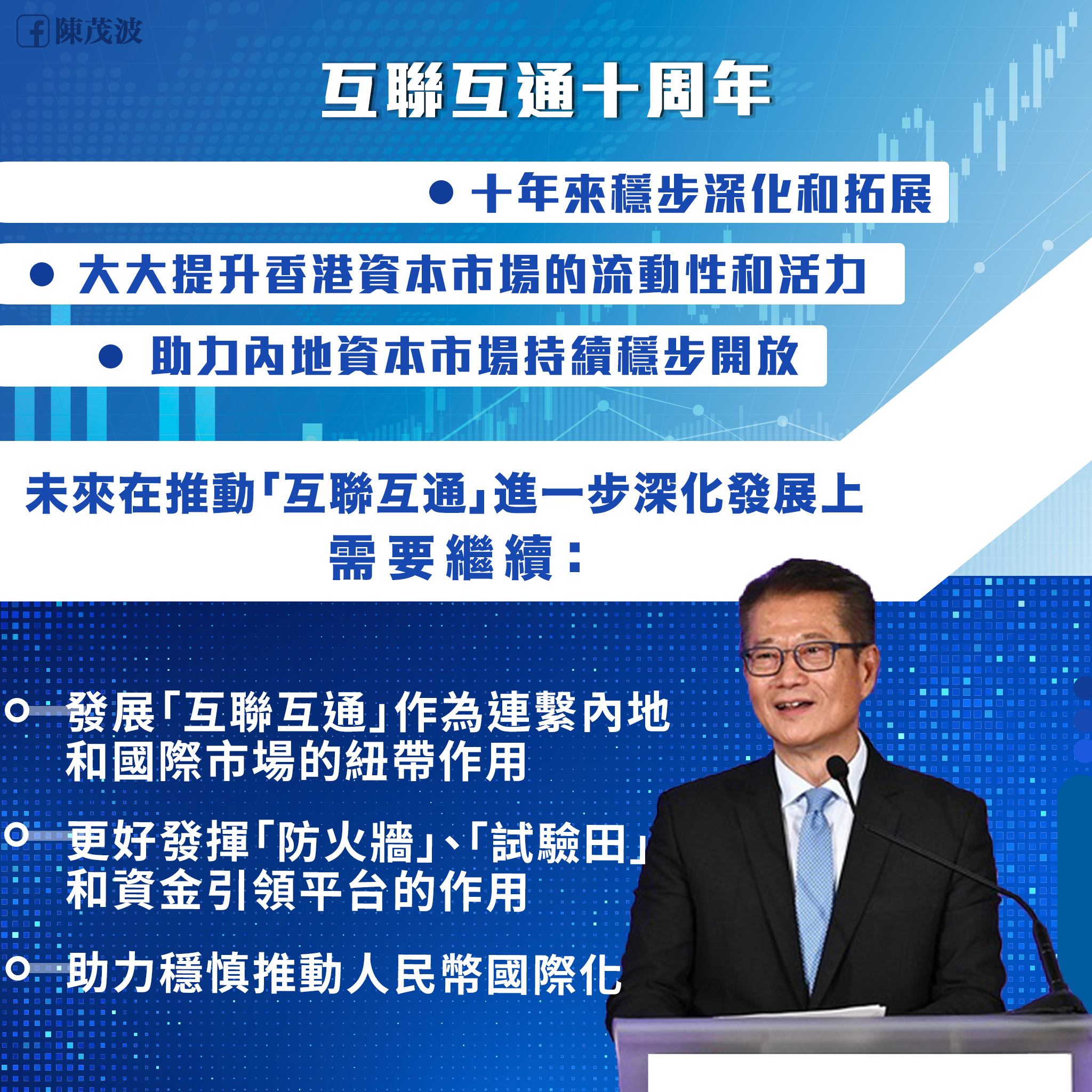 大公文匯全媒體報道,今日(17日)是內地與香港金融市場「互聯互通」十周年。財政司司長陳茂波發表網誌,形容這個促進內地和世界資本雙向流動的制度創新,讓國際投資者可以通過香港直接而便捷地投資內地市場,分享內地經濟發展的成果,同時也讓內地投資者利用香港便捷地進行境外資產配置,實現互利共贏。