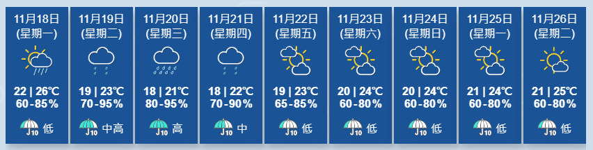 天文台預計,星期二及星期三間中有雨,氣溫逐步下降,最低氣溫降至18度或以下。