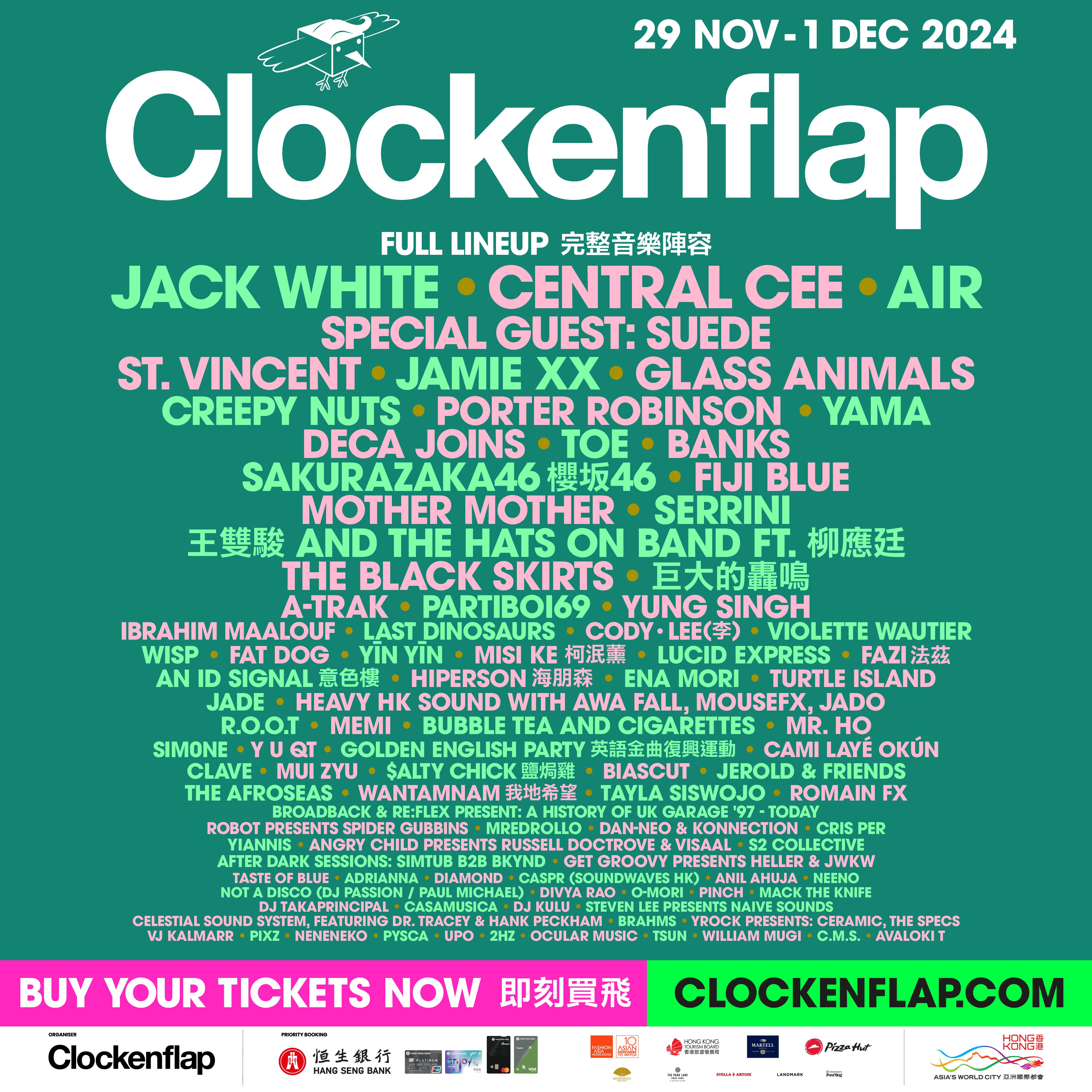 大公文匯全媒體報道,本港最盛大的國際戶外音樂及藝術節Clockenflap將於11月29日至12月1日在中環海濱舉行,今次戶外場地設立6個舞台,藍調搖滾殿堂巨星兼前The White Stripes主音Jack White、UK hip-hop新浪潮領軍人物Central Cee、法國電音天團Air、日本爆紅hip-hop二人組Creepy Nuts等輪番獻藝,另提供超過24家精心挑選的一流餐飲選擇。目前Clockenflap門票正火熱發售,三天周末門票票價為HK$1990,單日門票票價為HK$1280;18歲以下人士三天周末門票售HK$1590,單日門票為HK$880。