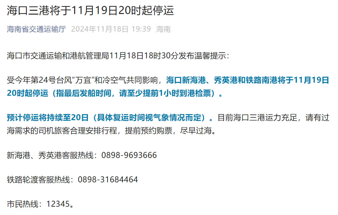 據海口市交通運輸和港航管理局消息,受今年第24號颱風「萬宜」和冷空氣共同影響,海口新海港、秀英港和鐵路南港將於11月19日20時起停運(指最後發船時間,請至少提前1小時到港檢票)。預計停運將持續至20日(具體復運時間視氣象情況而定)。目前海口三港運力充足。