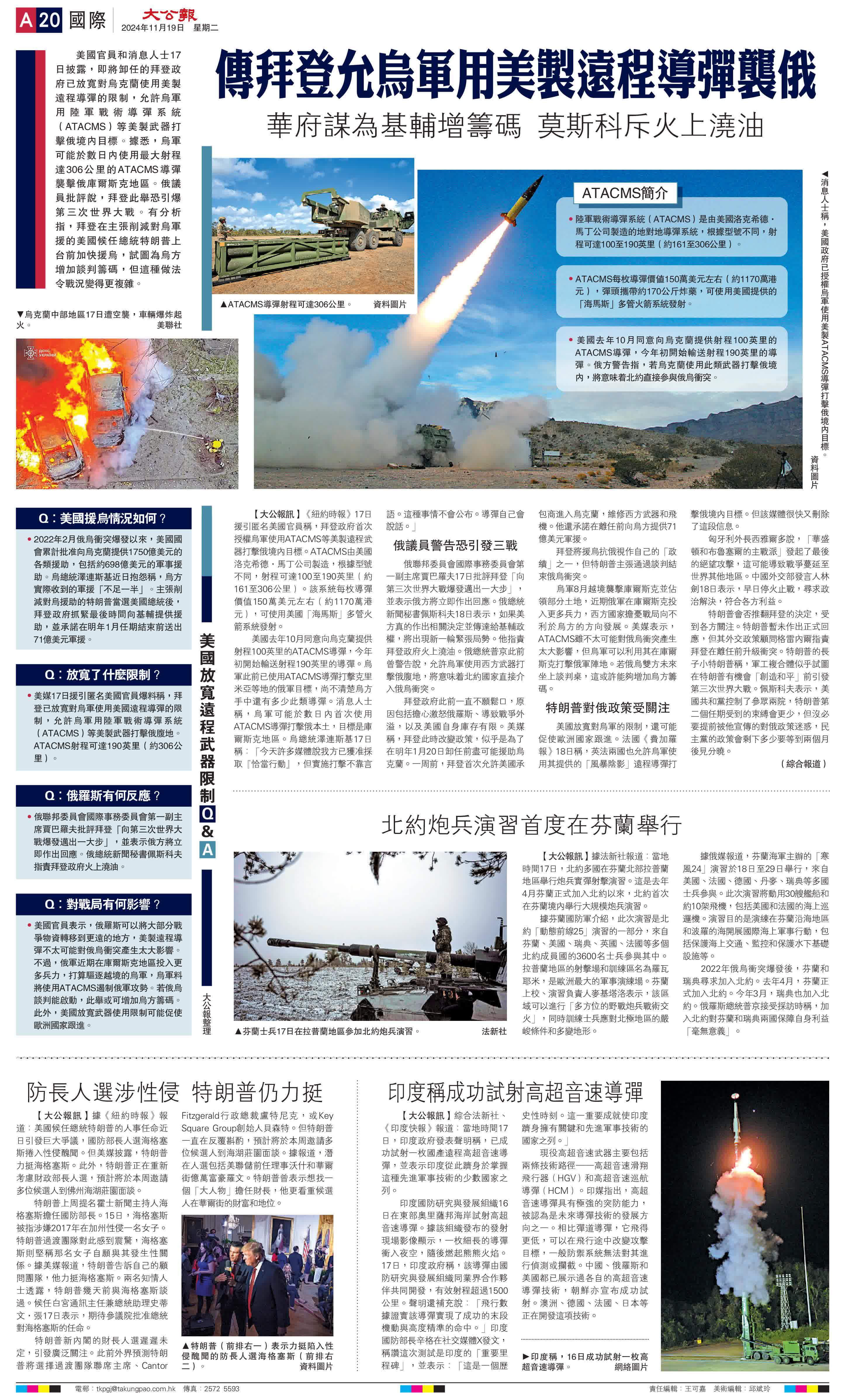 大公報綜合報道,美國官員和消息人士17日披露,即將卸任的拜登政府已放寬對烏克蘭使用美製遠程導彈的限制,允許烏軍用陸軍戰術導彈系統(ATACMS)等美製武器打擊俄境內目標。據悉,烏軍可能於數日內使用最大射程達306公里的ATACMS導彈襲擊俄庫爾斯克地區。俄議員批評說,拜登此舉恐引爆第三次世界大戰。有分析指,拜登在主張削減對烏軍援的美國候任總統特朗普上台前加快援烏,試圖為烏方增加談判籌碼,但這種做法令戰況變得更複雜。