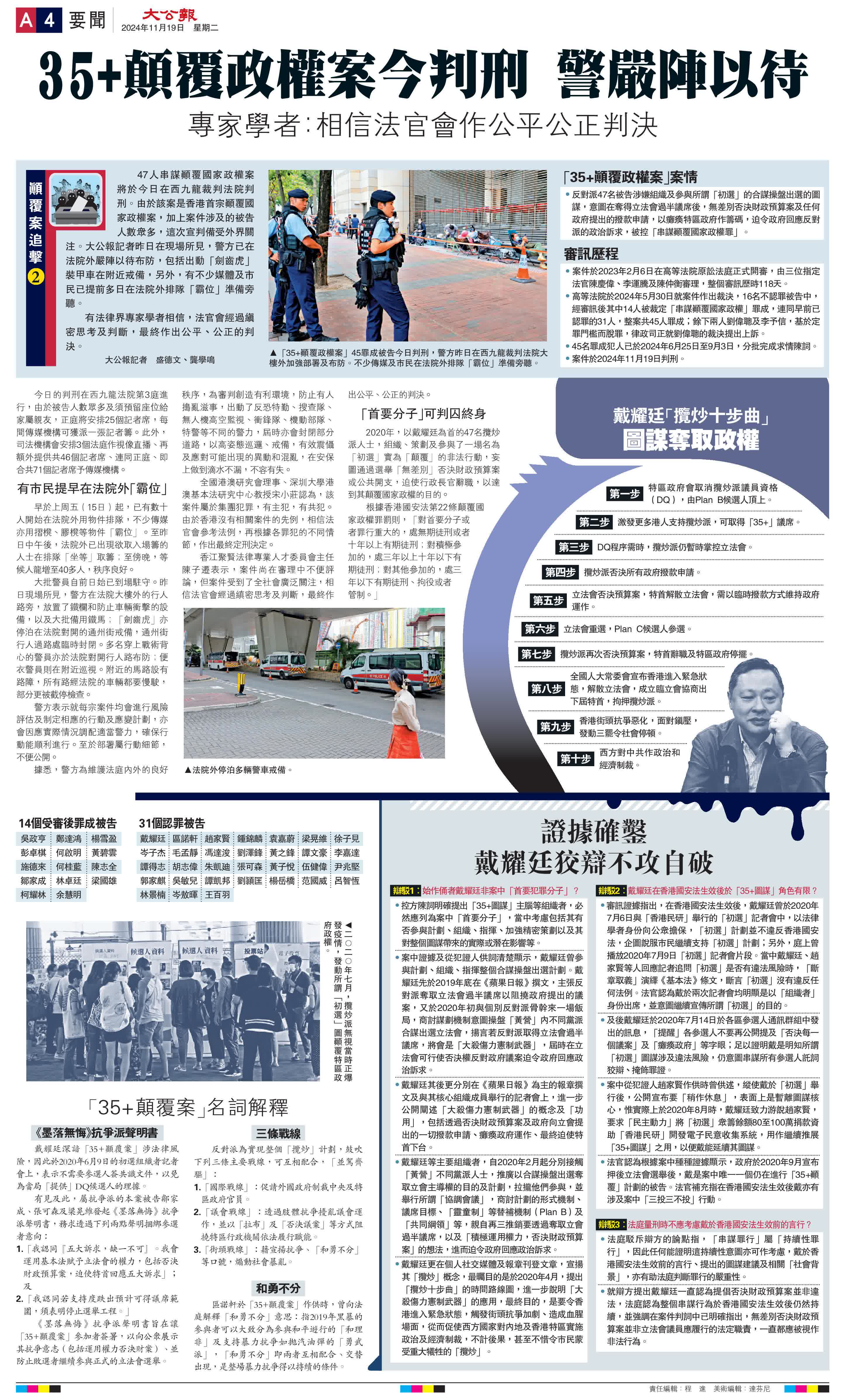 (大公報記者 盛德文、龔學鳴)47人串謀顛覆國家政權案將於今日在西九龍裁判法院判刑。由於該案是香港首宗顛覆國家政權案,加上案件涉及的被告人數眾多,這次宣判備受外界關注。大公報記者昨日在現場所見,警方已在法院外嚴陣以待布防,包括出動「劍齒虎」裝甲車在附近戒備,另外,有不少媒體及市民已提前多日在法院外排隊「霸位」準備旁聽。