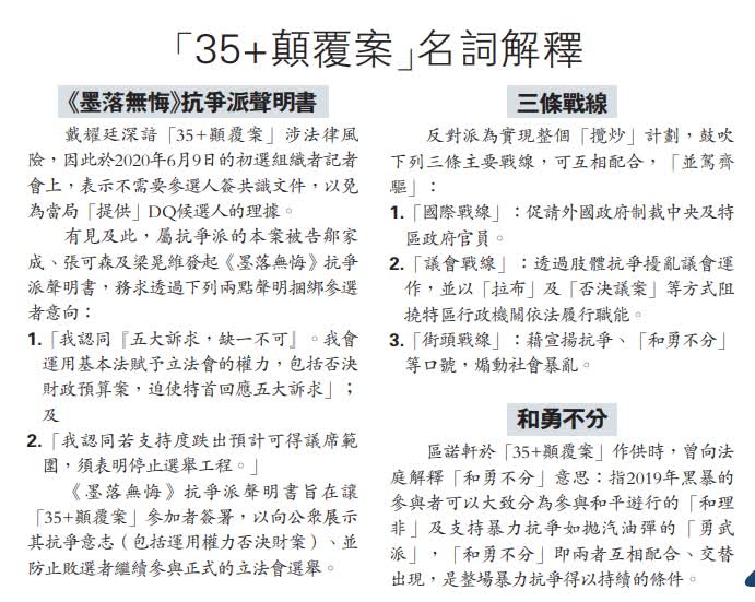2020年,以戴耀廷為首的47名攬炒派人士,組織、策劃及參與了一場名為「初選」實為「顛覆」的非法行動,妄圖通過選舉「無差別」否決財政預算案或公共開支,迫使行政長官辭職,以達到其顛覆國家政權的目的。