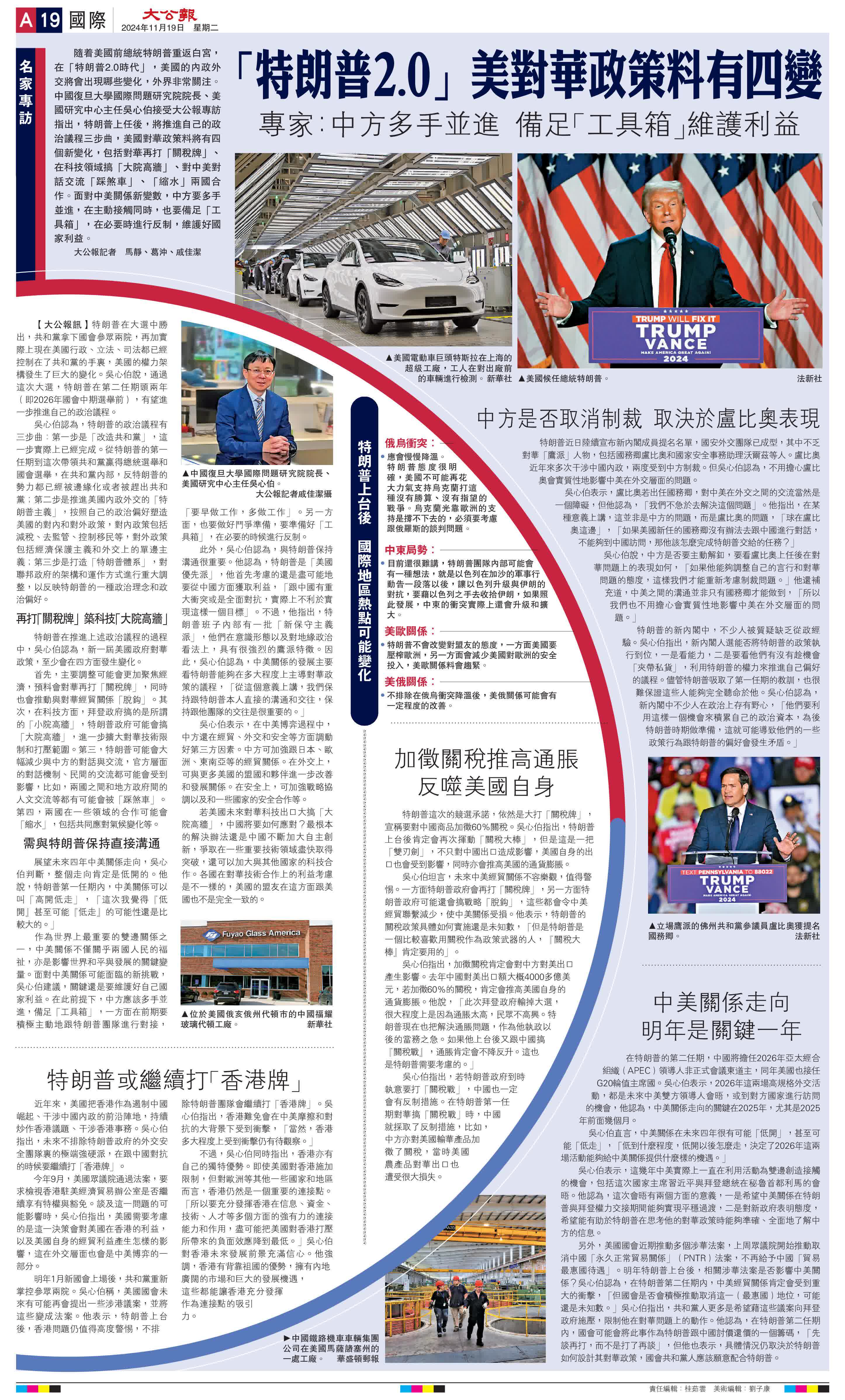 (大公報記者 馬靜、葛沖、戚佳潔)隨着美國前總統特朗普重返白宮,在「特朗普2.0時代」,美國的內政外交將會出現哪些變化,外界非常關注。中國復旦大學國際問題研究院院長、美國研究中心主任吳心伯接受大公報專訪指出,特朗普上任後,將推進自己的政治議程三步曲,美國對華政策料將有四個新變化,包括對華再打「關稅牌」、在科技領域搞「大院高牆」、對中美對話交流「踩煞車」、「縮水」兩國合作。面對中美關係新變數,中方要多手並進,在主動接觸同時,也要備足「工具箱」,在必要時進行反制,維護好國家利益。