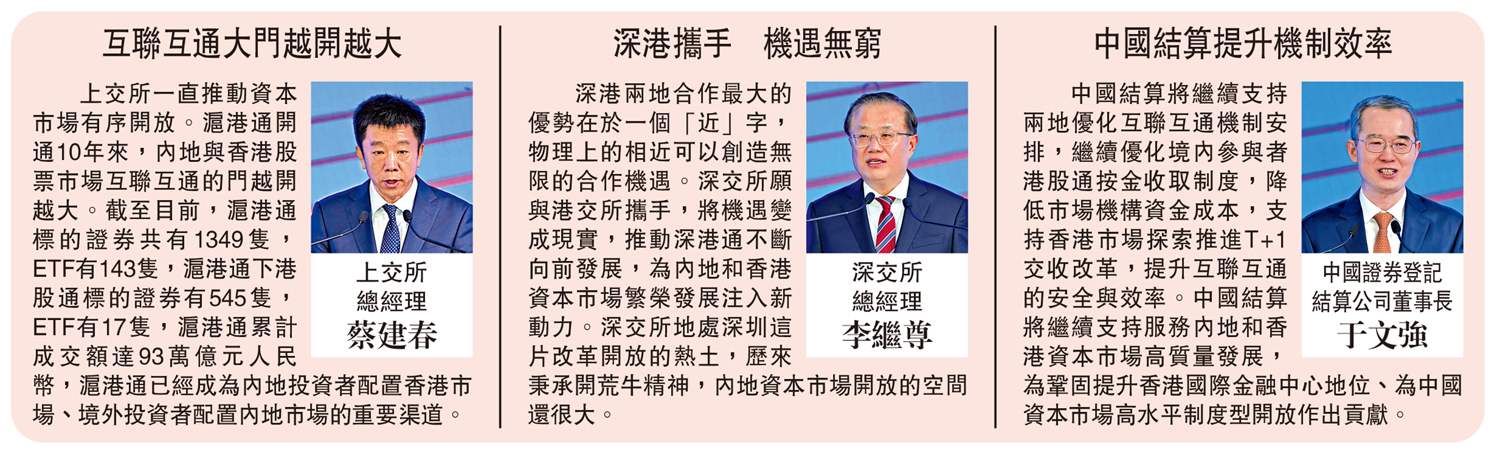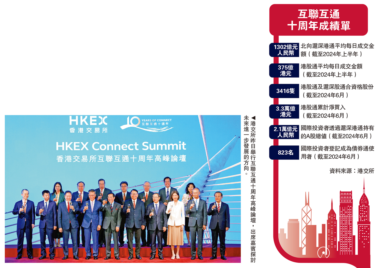 (大公報記者 彭子河)連接內地與香港資本市場的「互聯互通」機制自十年前推出以來,成績斐然,港交所昨日舉行互聯互通十周年高峰論壇,各界紛紛探討未來的發展方向。