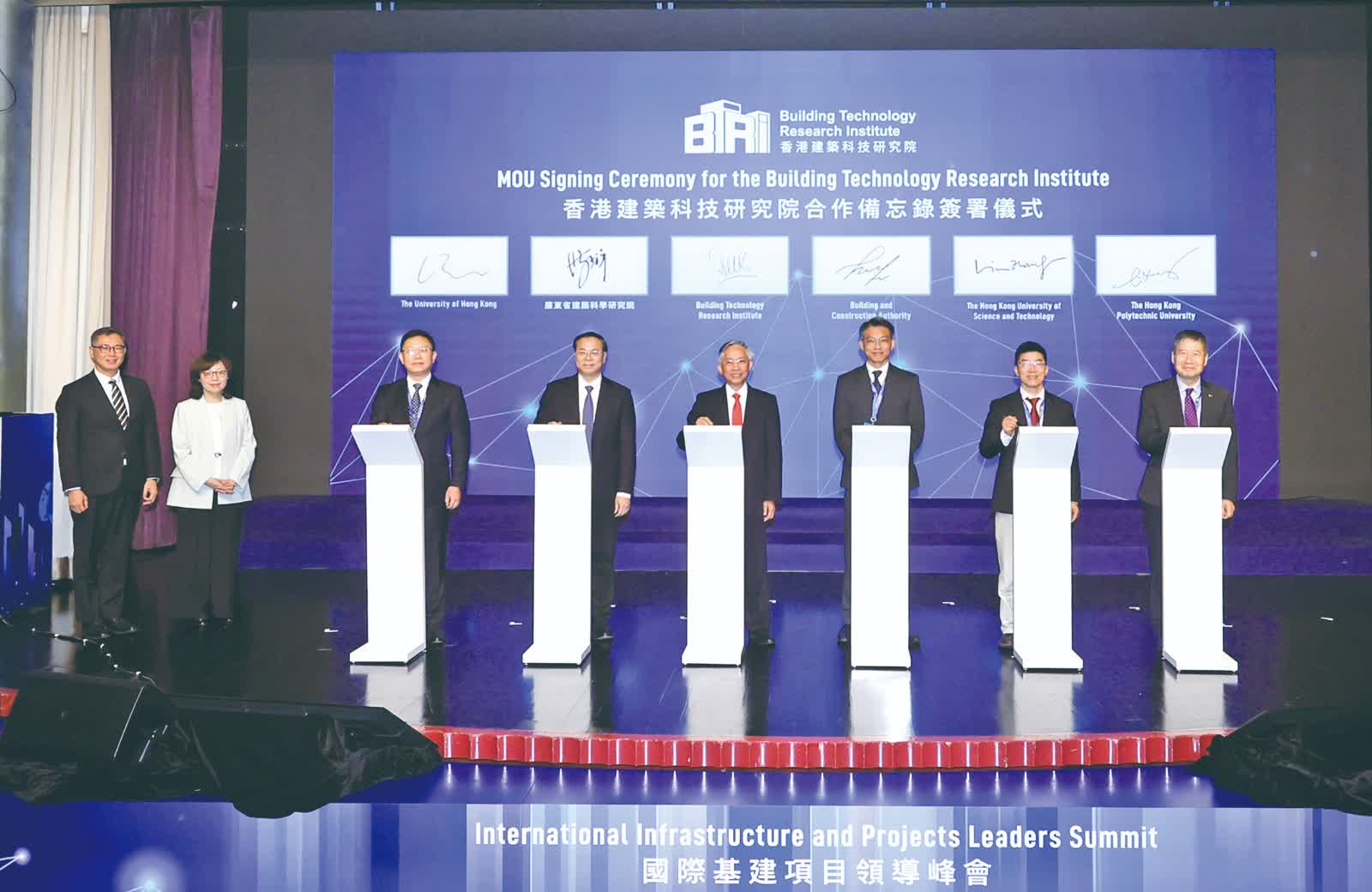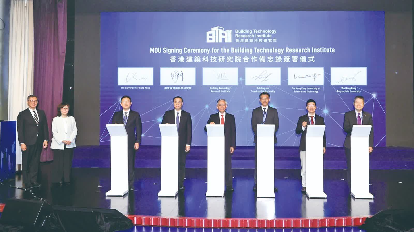 在發展局局長甯漢豪見證下,建科院與廣東省建築科學研究院、新加坡建設局,以及三間本地大學——香港大學、香港科技大學及香港理工大學簽署合作備忘錄,共同協作交流及推動創新應用,以應對建造業迫切的挑戰。