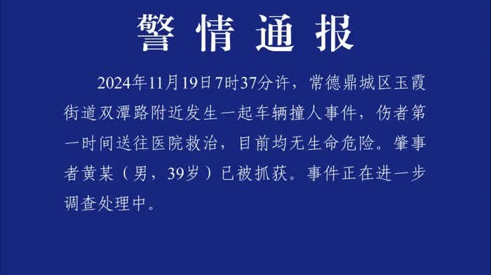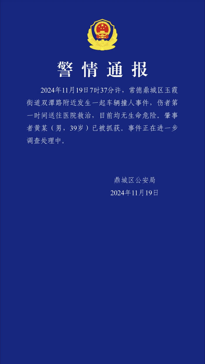 大公文匯網報道,據常德鼎城區公安局通報,11月19日7時37分許,常德鼎城區玉霞街道雙潭路附近發生一起車輛撞人事件,傷者第一時間送往醫院救治,目前均無生命危險。肇事者黃某(男,39歲)已被抓獲。事件正在進一步調查處理中。