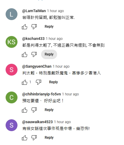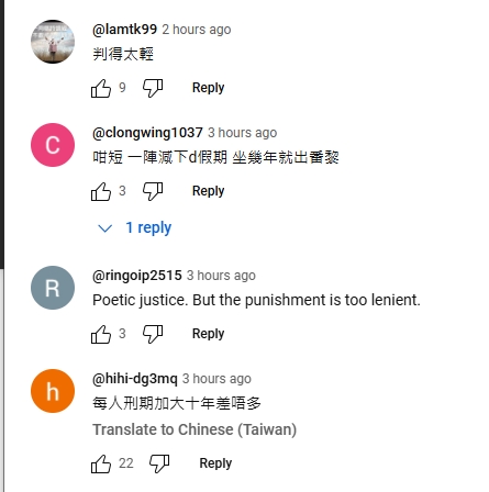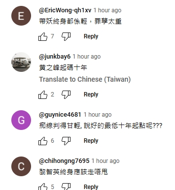 不少網民都直言「判咁輕」。有醒目網民指「一下減下D假期,坐幾年就出番黎」,質疑判刑太輕。有人引述其他國家國安相關法例,指「在英國和美國,不是判死刑就是判終身」「HK is too lenient(寬容)」。有網民認為刑期至少應「加十年」或「翻三倍」,當中有人點名戴耀廷及黃之鋒,謂「戴妖(戴耀廷)終身都係輕,罪孽太重」「黃之鋒起碼十年」等。