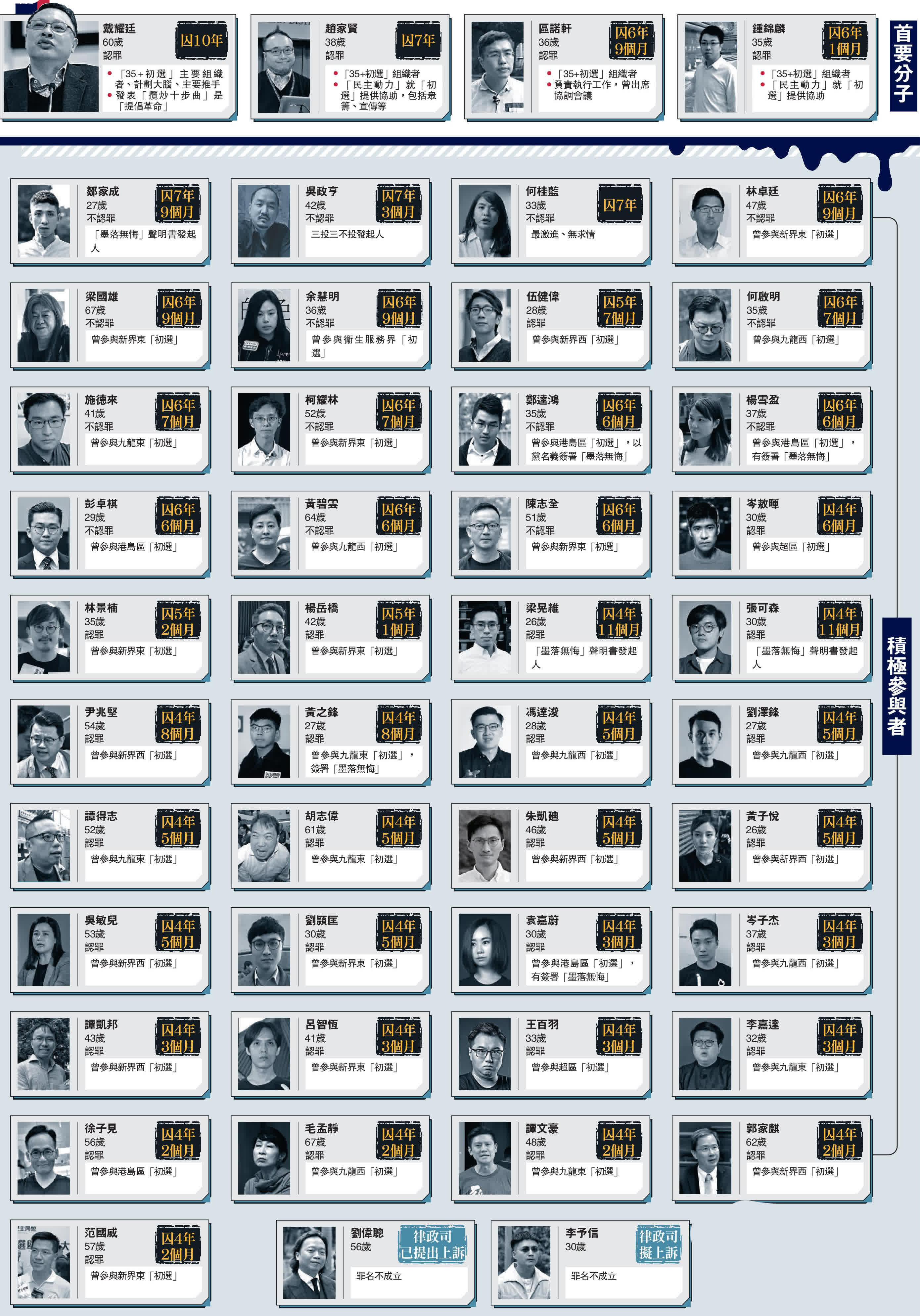 法官昨日就45名被告判刑,以下為各被告的刑期與判詞擇要。