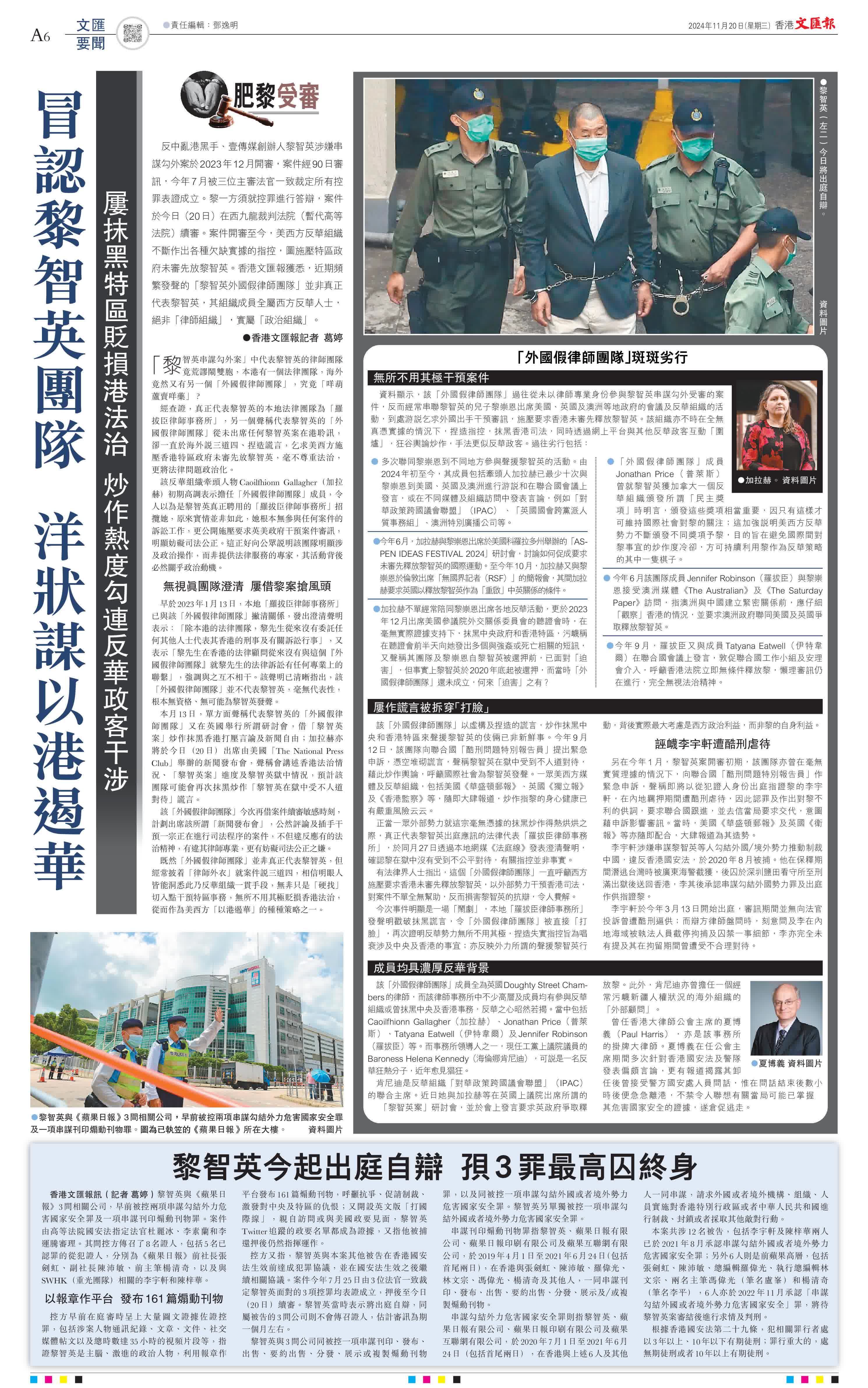 (香港文匯報記者 葛婷)反中亂港黑手、壹傳媒創辦人黎智英涉嫌串謀勾外案於2023年12月開審,案件經90日審訊,今年7月被三位主審法官一致裁定所有控罪表證成立。黎一方須就控罪進行答辯,案件於今日(20日)在西九龍裁判法院(暫代高等法院)續審。案件開審至今,美西方反華組織不斷作出各種欠缺實據的指控,圖施壓特區政府未審先放黎智英。香港文匯報獲悉,近期頻繁發聲的「黎智英外國假律師團隊」並非真正代表黎智英,其組織成員全屬西方反華人士,絕非「律師組織」,實屬「政治組織」。