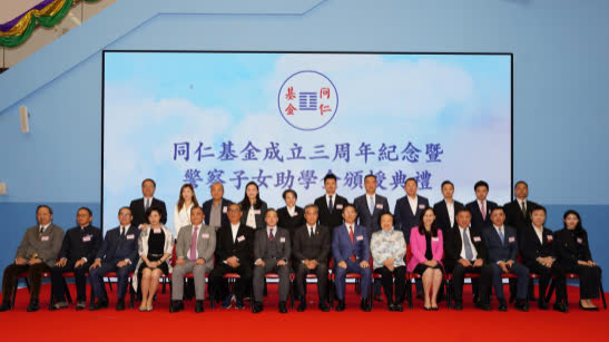 活動現場,同仁基金頒發獎助學金共309萬港幣,其中有77名警察子女獲2024-25年度民心學校助學金,一人獲2023-24年度內地大學升學獎學金。