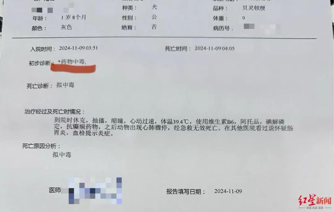 事發當晚,李女士先後帶狗前往兩家寵物醫院,最終因搶救無效,兩隻狗都不幸離開。醫院開具的死亡證明中,初步診斷為藥物中毒。11月19日,紅星新聞記者致電上述其中一家動物醫院,工作人員告訴記者,狗的中毒症狀表現為抽搐,目前可以確認中毒,但具體毒物還需專業機構鑒定。據悉,該醫院近期還接收了另外兩隻因中毒死亡的寵物狗。