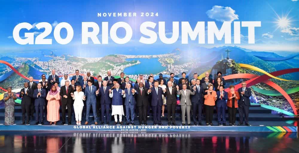 19日中午,習近平主席在巴西里約熱內盧出席二十國集團領導人第十九次峰會閉幕會議。閉幕會議後,習近平同其他與會領導人合影。