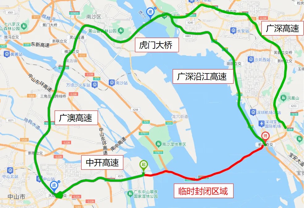 中山往深圳方向:中開高速—廣澳高速—南沙大橋—廣深沿江高速或廣深高速。