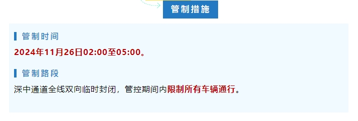 2024年11月26日02:00至05:00期間,深中通道全線雙向臨時封閉,管控期間內限制所有車輛通行。