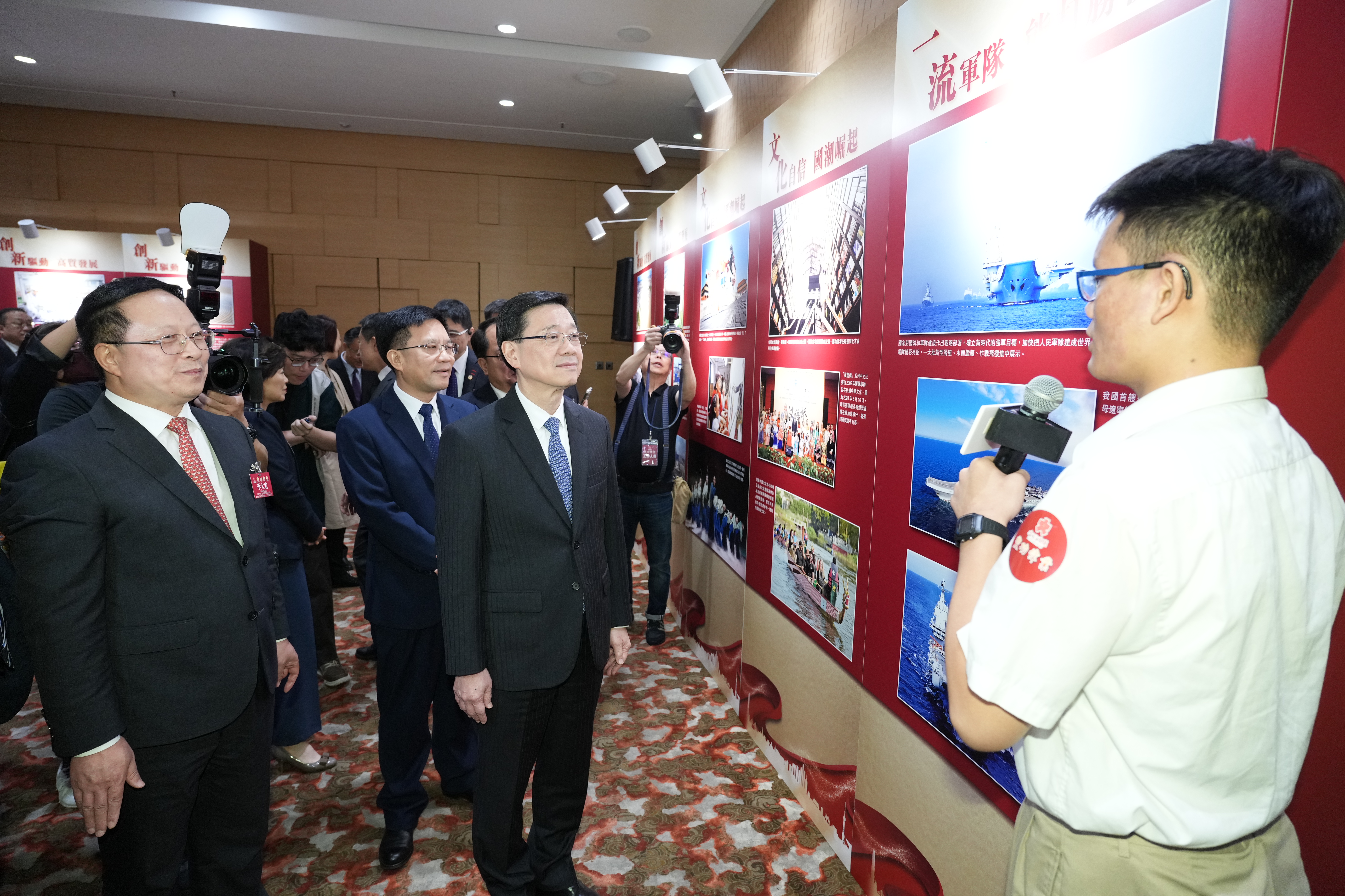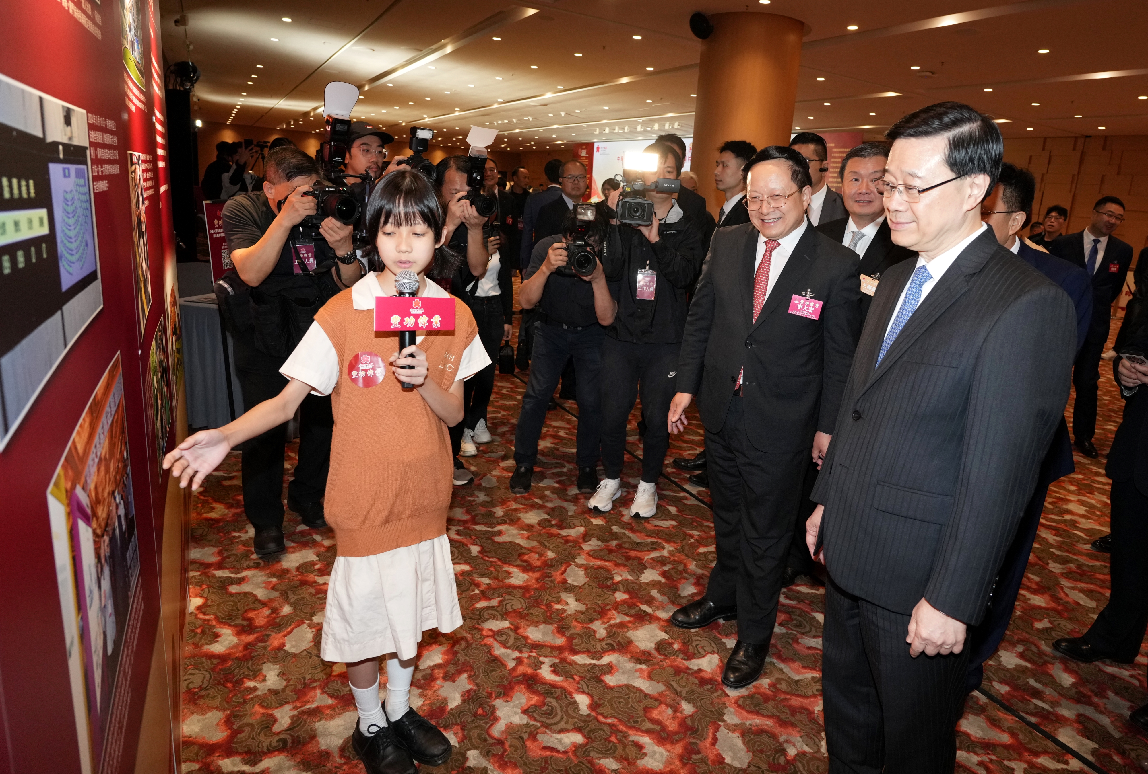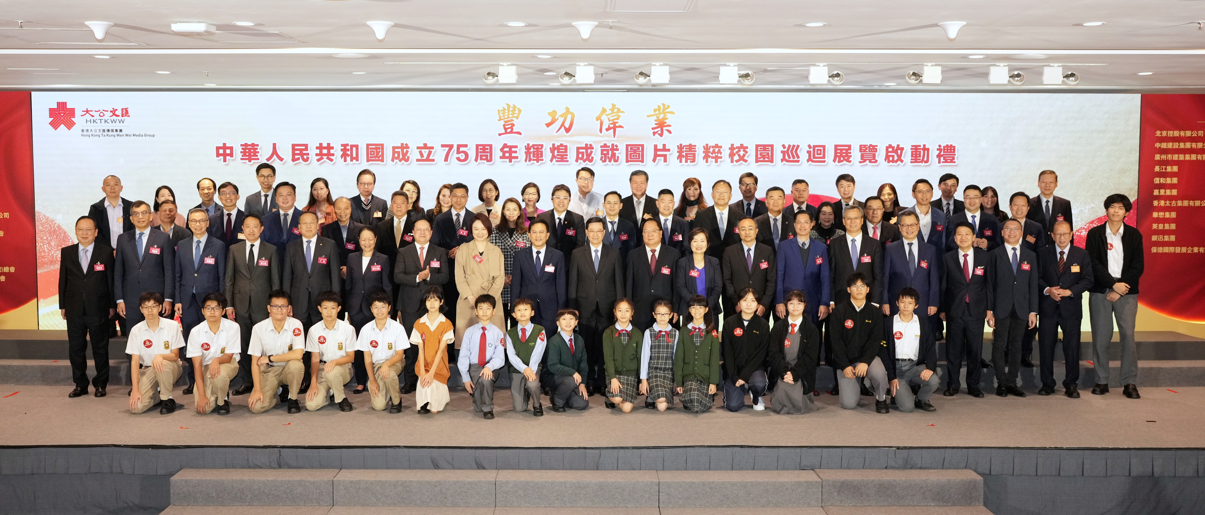 大公文匯網報道,11月21日,「豐功偉業——中華人民共和國成立75周年輝煌成就圖片精粹校園巡迴展覽」啟動禮在香港會議展覽中心隆重舉行。香港特別行政區行政長官李家超,香港大公文匯傳媒集團董事長兼香港文匯報社社長、大公報社社長李大宏分別致辭,中央政府駐港聯絡辦秘書長王松苗、外交部駐港公署副特派員潘雲東、全國人大常委會委員李慧琼、香港特區政府教育局局長蔡若蓮、中央政府駐港聯絡辦宣傳文體部副部長李曙光、香港特區政府新聞處處長廖李可期等嘉賓主禮,逾百位社會各界翹楚共同見證這一盛事。