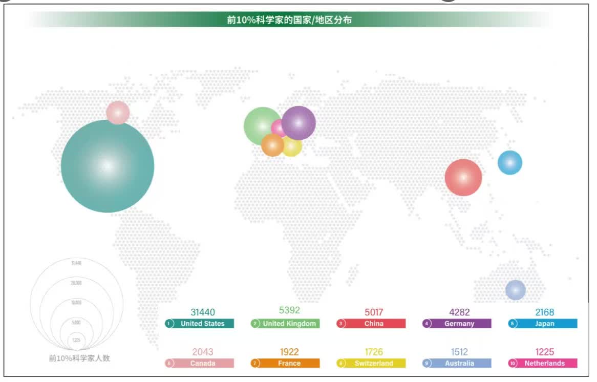 榜單顯示,全球貢獻份額top20的科學家中,美國科學家共10位佔據一半,德國科學家5位。中國貢獻份額top20的科學家中,北京13位,港大1位。數據顯示,中國擁有的前10%科學家數量為全球第三。