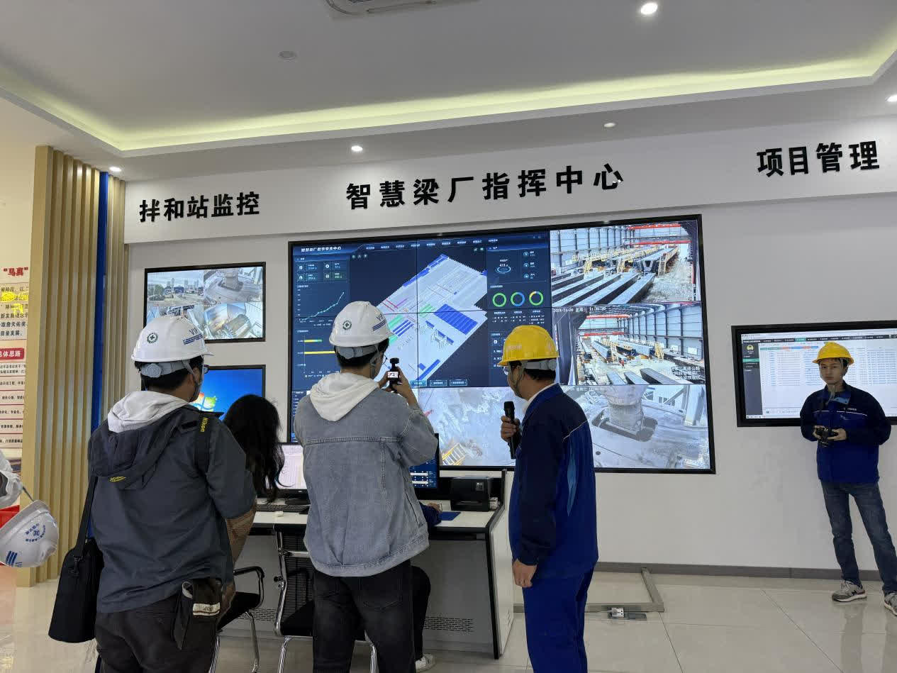 「傳統施工方法,一片梁預製至少要8天,我們只要3天,生產效率提升240%;而且人員較傳統梁場投入減少30%,只要4個人,每天可以完成5片梁的施工。」何善美介紹,混凝土也是採用智能澆築系統,由「魚雷罐、布料機、振搗系統」組成,實現砼智能化、流水線式的運輸、布料,並通過附着式振搗系統,實現自動化振搗作業。「單個構件澆築速率提升1.5倍;同時通過指揮中心可實現混凝土運輸、布料、振搗工序遠程自動化控制,讓我們的梁片生產向『3D自動打印』目標靠攏。」