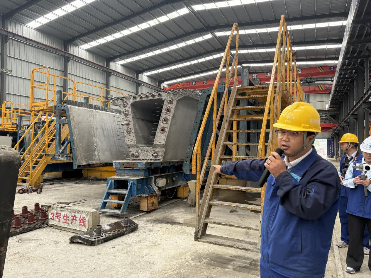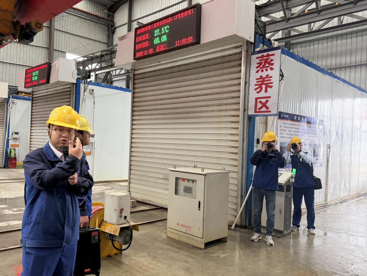 在生產區域,混凝土集中配送中心、鋼筋集中配送中心以及預製件製造中心與傳統的露天模式完全不同,而是高度集中、科學布局為流水線「廠房」模式的數智梁廠。在「智能生產」區域,包含鋼筋綁紮區、內模脫膜區、澆築區、蒸養區等8個功能區。何善美介紹,預製梁第一步就是鋼筋綁紮,然後套上內膜、外模板,進行混凝土的澆築;接着把模板拆除後,移到專門的蒸養箱中進行養護,養護結束後進行張拉。經過這樣一個流程,一片梁就預製完成。