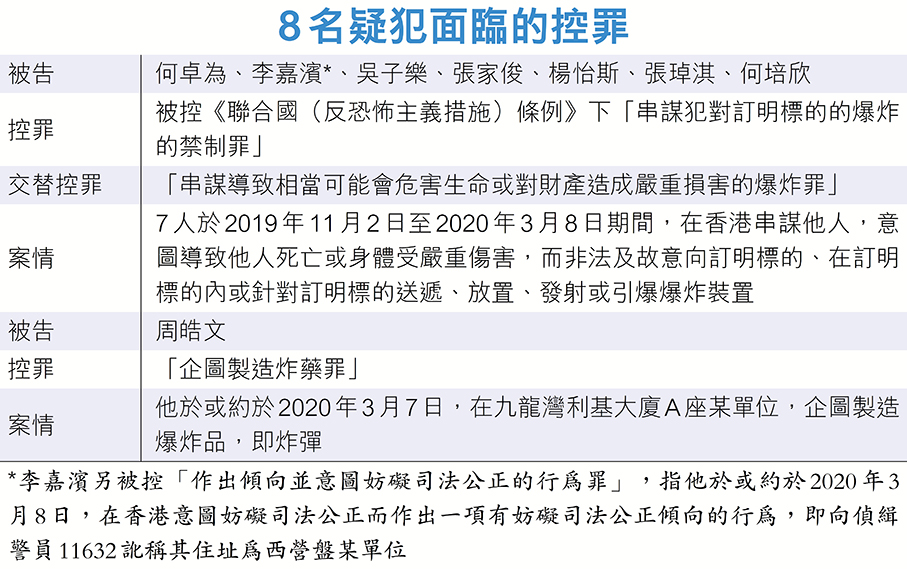 8名被告依次為37歲無業漢何卓為、26歲裝修工李嘉濱、28歲金融從業員吳子樂、30歲程式工程師張家俊、29歲文員楊怡斯、25歲入境處登記主任張琸淇、23歲大學生何培欣及25歲測量員周皓文。首7名被告被控《聯合國(反恐怖主義措施)條例》下「串謀犯對訂明標的的爆炸的禁制罪」,周皓文則被控一項「企圖製造炸藥」罪。