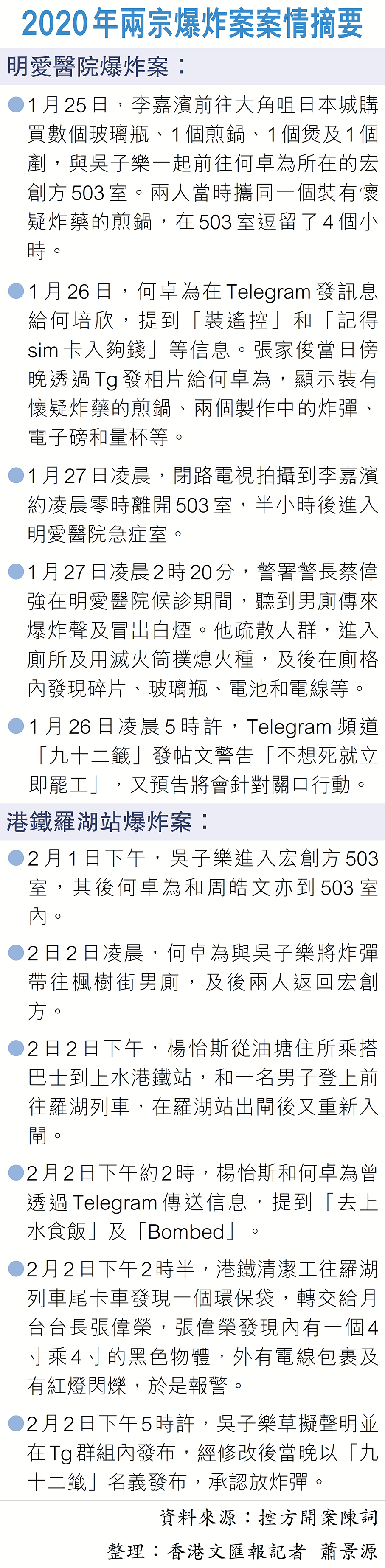 (香港文匯報 記者 葛婷)香港警方在2020年3月偵破在社交媒體上自稱「九十二籤」的黑暴極端團夥,其後拘捕多人。其中,8名涉案被告分別被控《聯合國(反恐怖主義措施)條例》下「串謀犯對訂明標的的爆炸的禁制罪」,以及「企圖製造炸藥」罪。案件昨日在高等法院開審。控方開案陳詞指,在8名被告中,7人串謀3次爆炸事件,包括明愛醫院和羅湖港鐵站爆炸案。有被告曾在涉案Telegram頻道以「九十二籤」名義發帖文承認責任,警告醫護「不想死就立即罷工」,聲言目的是迫使政府「封關」。該7人更計劃於將軍澳尚德停車場外放置炸彈,惟警方及時行動而未能實施。