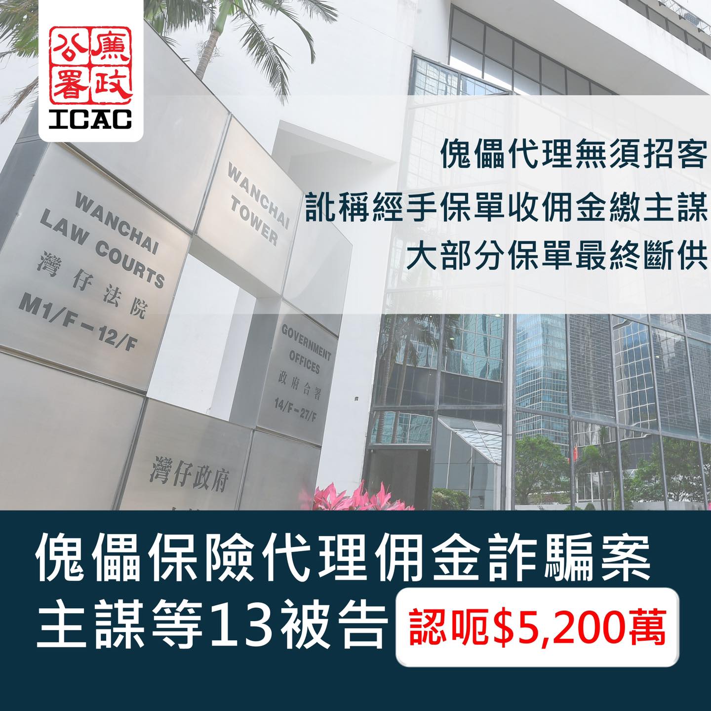 大公文匯全媒體報道,廉政公署貪污調查揭發多人參與「傀儡保險代理」串謀詐騙及「洗黑錢」勾當,訛稱經手處理478份保單以獲兩間保險公司發放佣金共約5200萬元。案中主謀,即一名保險公司前分行經理,以及12名「傀儡保險代理」,今日(23日)在區域法院承認控罪。