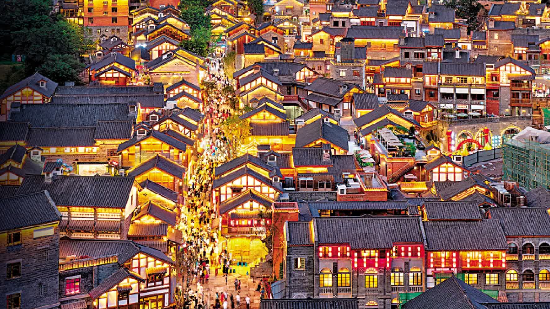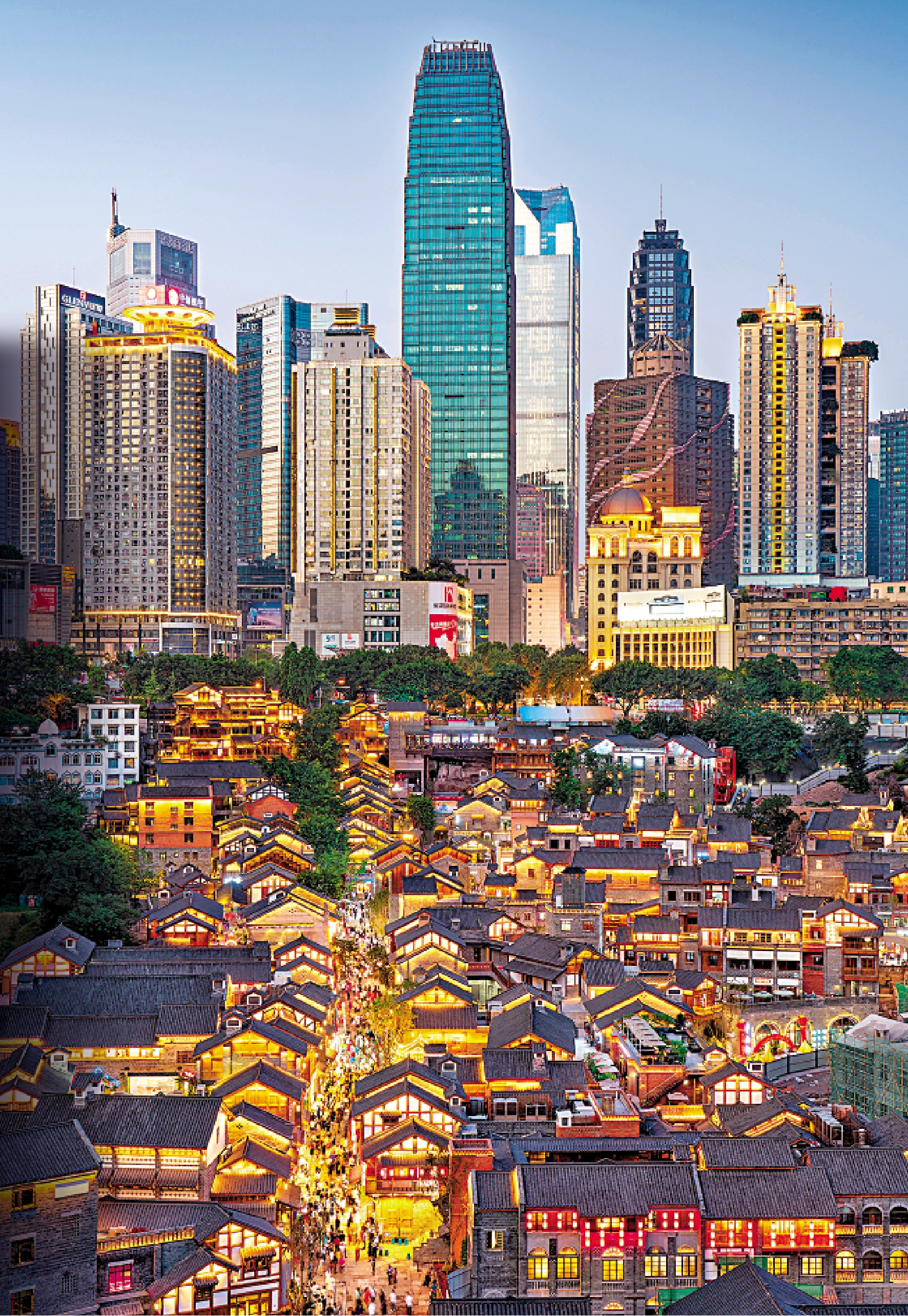 民國時期,洪崖洞作為河運貨物集散地,布滿高低錯落的吊腳樓建築群,2006年改建成洪崖洞民俗風貌區,吊腳樓群為鋼筋混凝土結構建築,通過對傳統吊腳樓的吊腳形式、穿斗式結構以及牆體顏色、雕花的「復刻」,實現了歷史與現代融合。每層樓功能不同,有餐館、小吃街、酒吧、咖啡廳、土特產商舖等,頂層是異域風情城市陽台,可乘坐電梯直達。在洪崖洞頂層平台,可觀兩江匯流、眺洪崖滴翠,也可逛山城老街、賞巴渝文化、燙重慶火鍋、品各地美食。