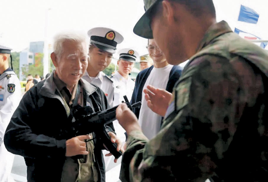 還有一位小小男生,不斷拉住身旁的海軍官兵發問:「這個魚雷怎麼打到潛水艇啊?」、「有沒有可能打不中」、「這飛機坐幾個人呢?」「萬一有導彈來了打直升機怎麼辦?」充分顯現出他對祖國軍事實力的滿心好奇。