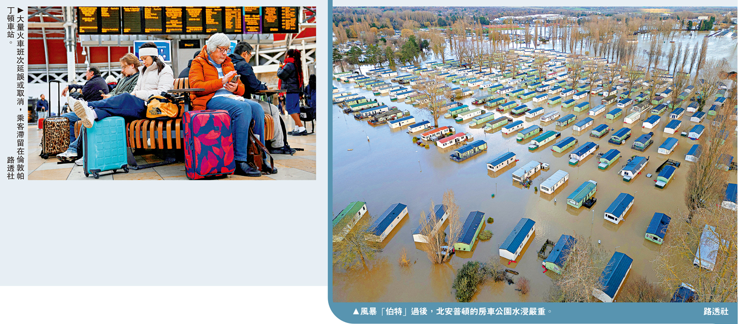 受風暴「伯特」影響,英國陸空交通大亂,倫敦希思羅機場24日當天約有300架航班被取消,近1200架航班延誤。從倫敦到英國西南部的列車被取消,英格蘭中部鐵路服務持續中斷。負責運營倫敦往返威爾士區域的英國大西部鐵路公司25日稱,當天該線路所有列車被取消。