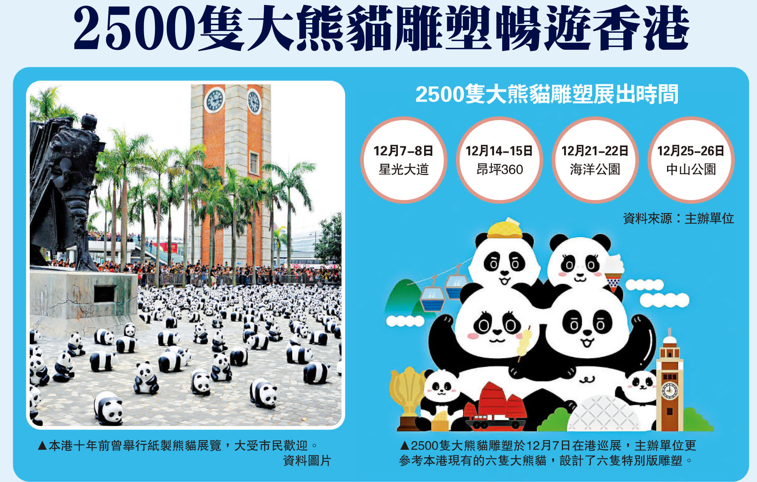 下月7日起一連三個星期六及星期日,以及下月25和26日聖誕節假期,大熊貓雕塑將依次在星光大道、昂坪360、海洋公園及中山公園展出,數目比10年前的同類展覽多900隻。