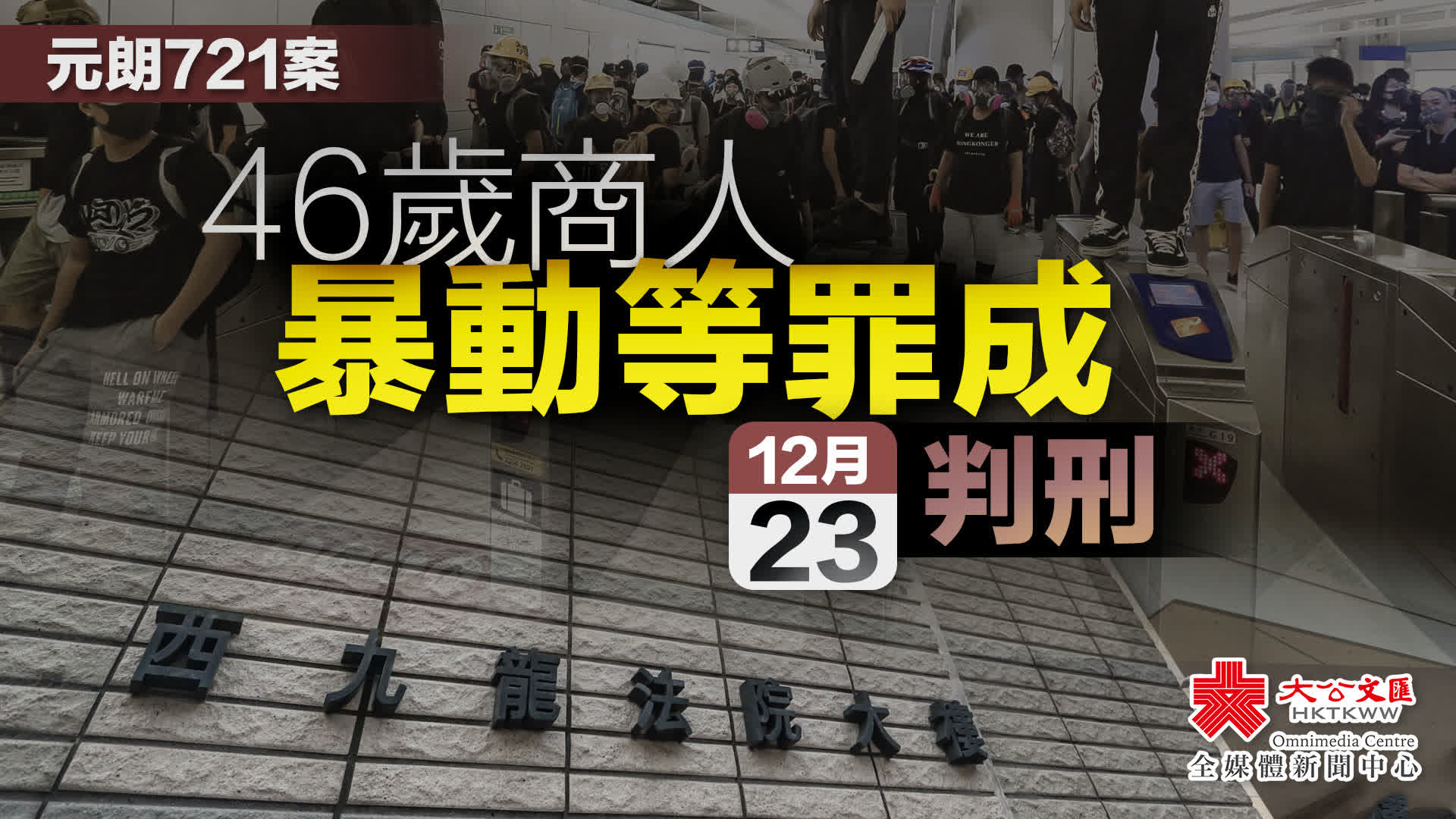 大公文匯全媒體報道,2019年7月21日元朗發生暴動事件,一名涉案男子事後被捕,早前否認暴動和串謀有意圖而傷人兩罪受審,案件今日(26日)於西九龍裁判法院(暫代區域法院)裁決。法官最終裁定被告兩罪罪成,並把案件押後至12月23日判刑,期間被告需還柙看管。