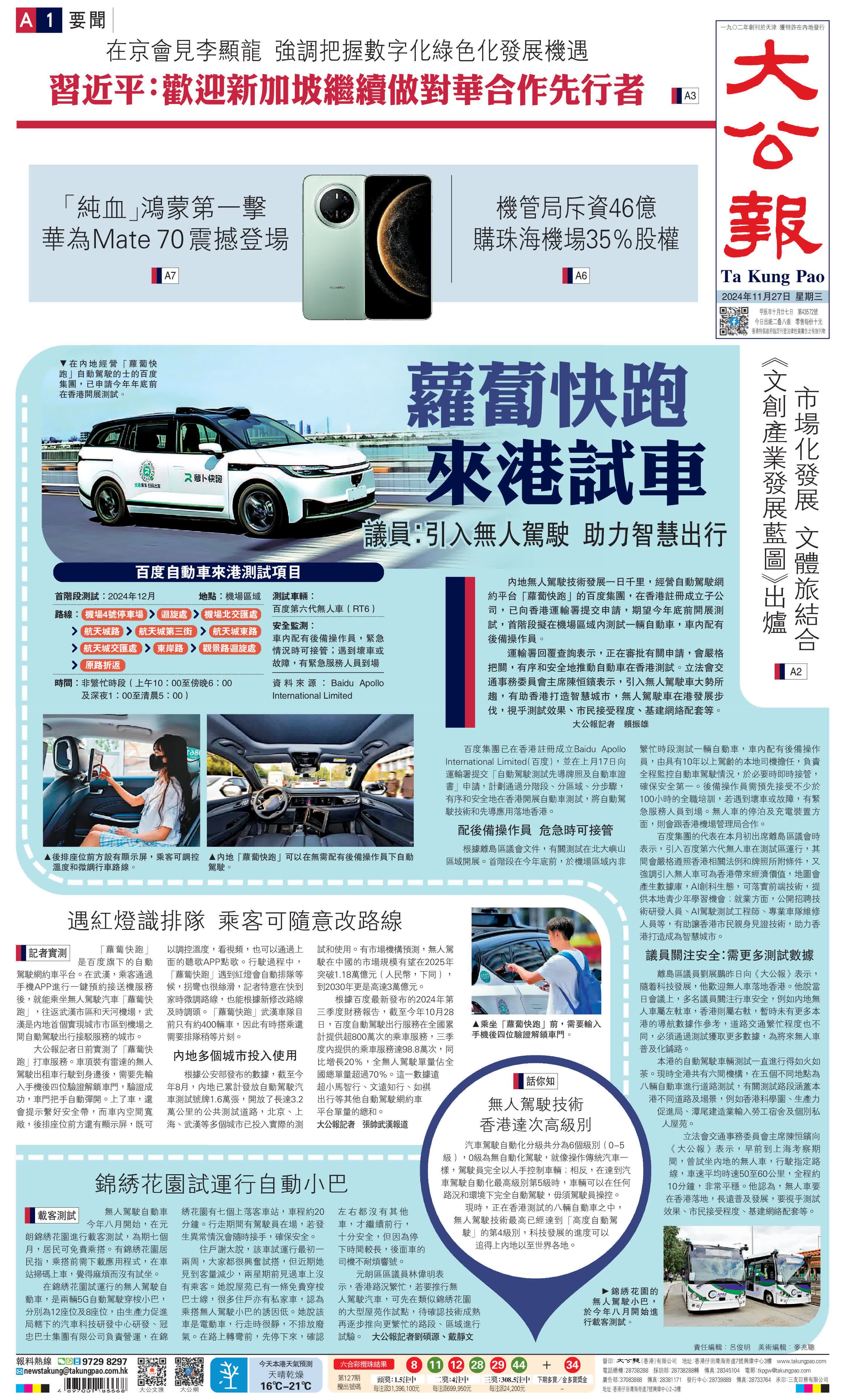 (大公報記者 賴振雄 張帥 劉碩源 戴靜文)內地無人駕駛技術發展一日千里,經營自動駕駛網約平台「蘿蔔快跑」的百度集團,在香港註冊成立子公司,已向香港運輸署提交申請,期望今年底前開展測試,首階段擬在機場區域內測試一輛自動車,車內配有後備操作員。