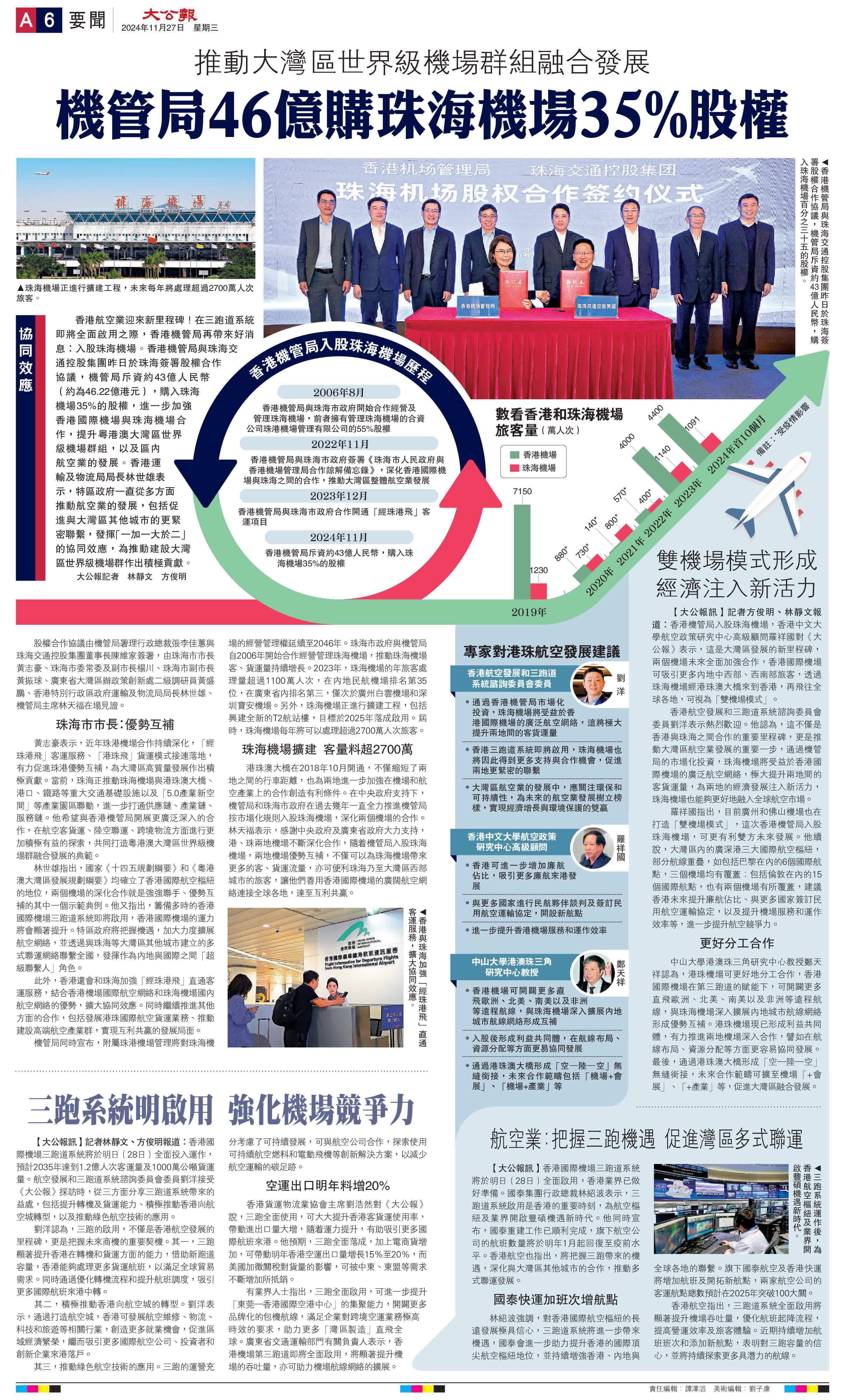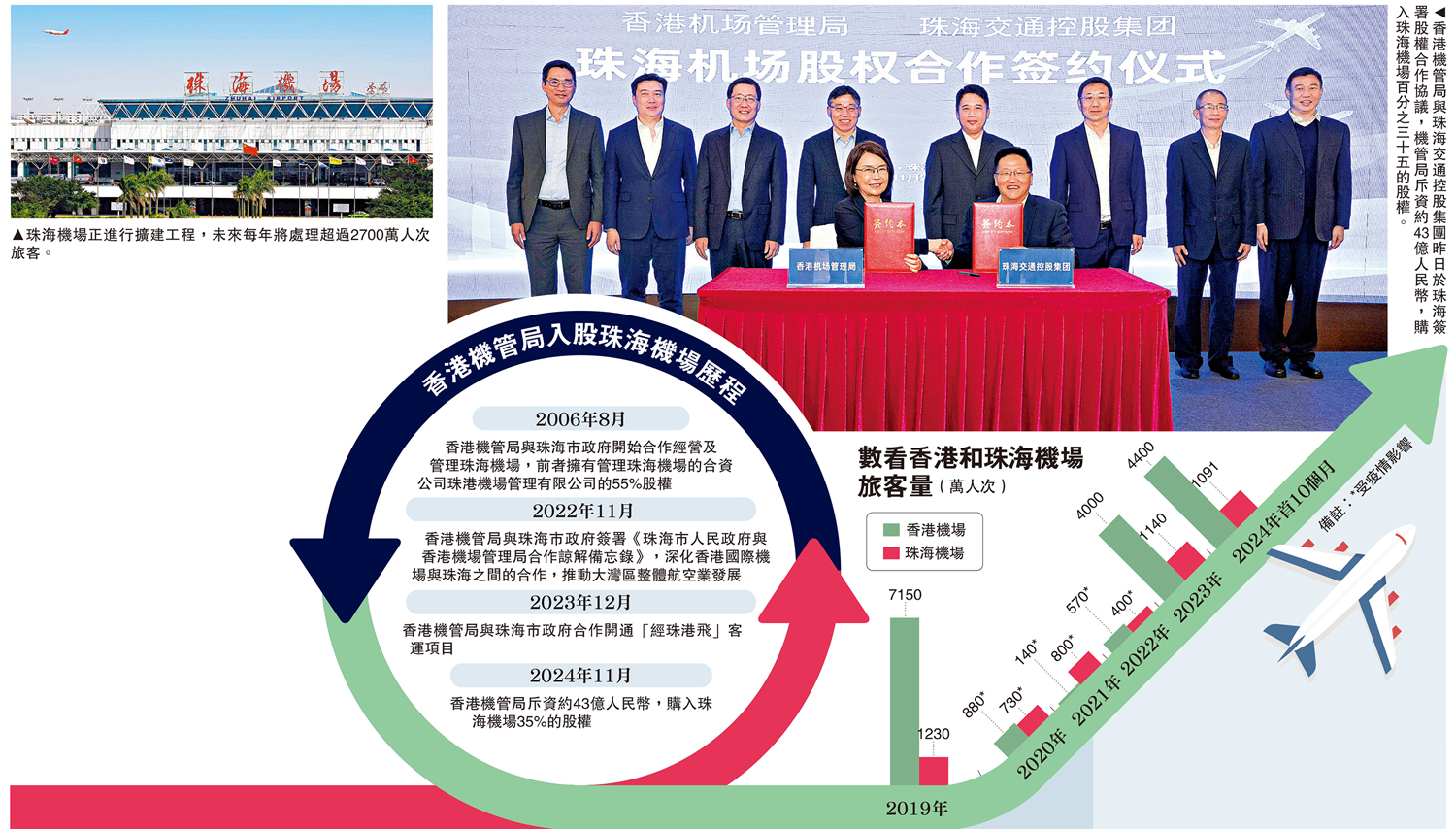 (大公報記者 林靜文 方俊明)香港航空業迎來新里程碑!在三跑道系統即將全面啟用之際,香港機管局再帶來好消息:入股珠海機場。香港機管局與珠海交通控股集團昨日於珠海簽署股權合作協議,機管局斥資約43億人民幣(約為46.22億港元),購入珠海機場35%的股權,進一步加強香港國際機場與珠海機場合作,提升粵港澳大灣區世界級機場群組,以及區內航空業的發展。香港運輸及物流局局長林世雄表示,特區政府一直從多方面推動航空業的發展,包括促進與大灣區其他城市的更緊密聯繫,發揮「一加一大於二」的協同效應,為推動建設大灣區世界級機場群作出積極貢獻。