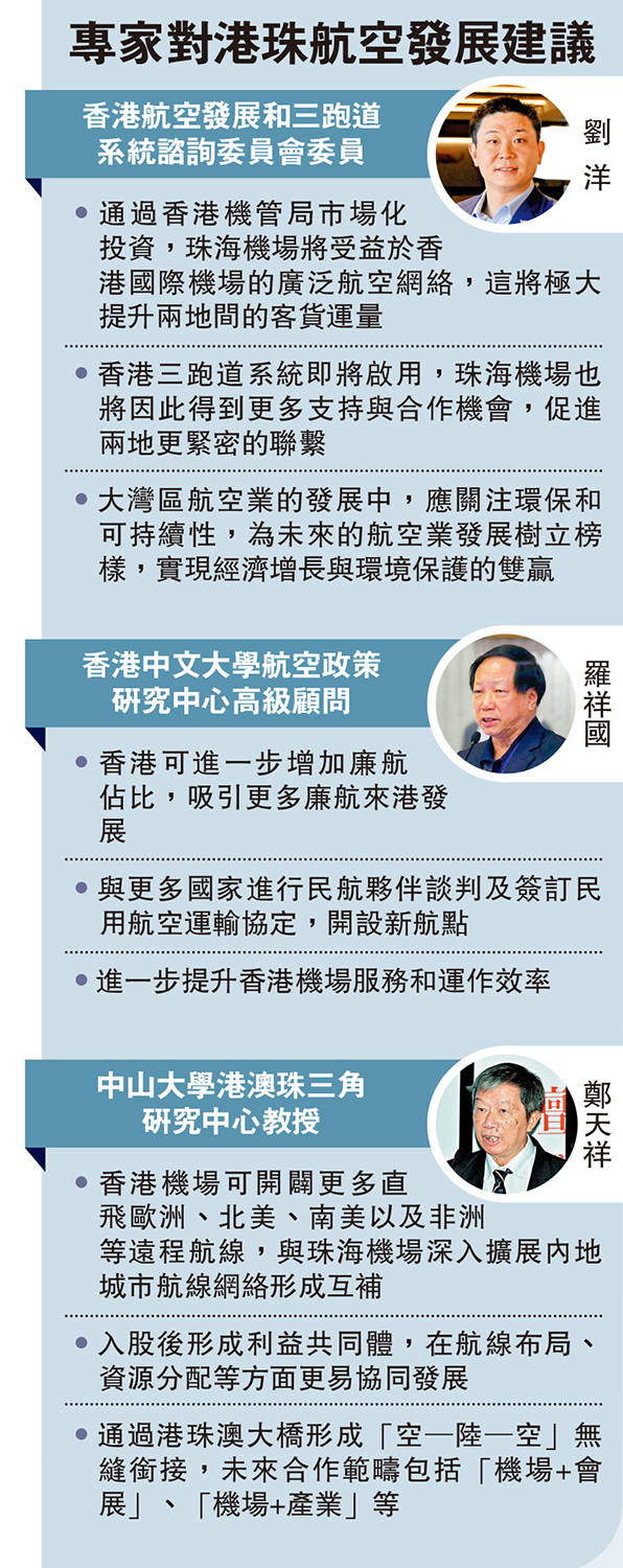 中山大學港澳珠三角研究中心教授鄭天祥認為,港珠機場可更好地分工合作,香港國際機場在第三跑道的賦能下,可開闢更多直飛歐洲、北美、南美以及非洲等遠程航線,與珠海機場深入擴展內地城市航線網絡形成優勢互補。港珠機場現已形成利益共同體,有力推進兩地機場深入合作,譬如在航線布局、資源分配等方面更容易協同發展。最後,通過港珠澳大橋形成「空─陸─空」無縫銜接,未來合作範疇可擴至機場「+會展」、「+產業」等,促進大灣區融合發展。
