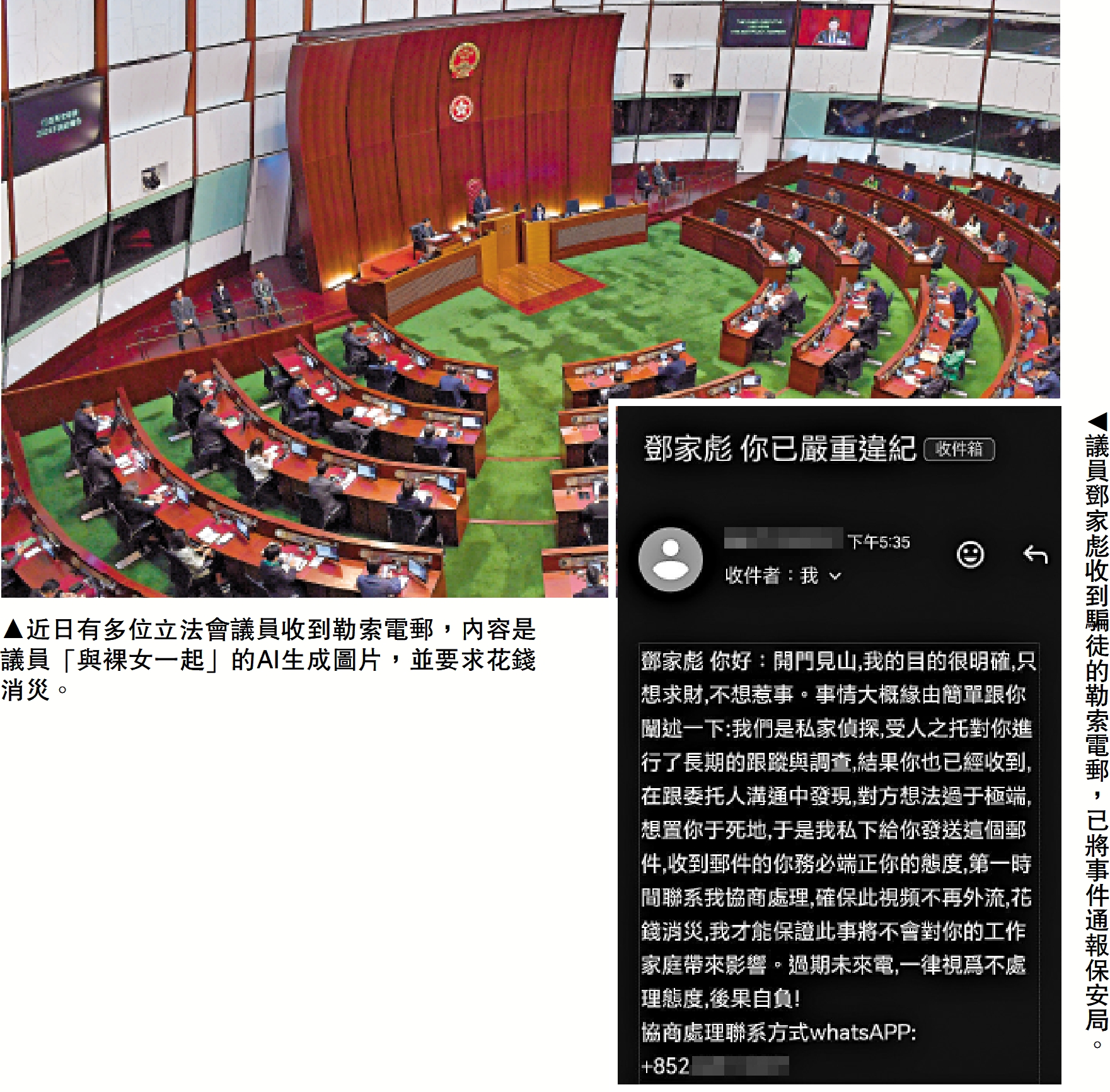 (大公報記者 郭如佳)近日有多位現屆立法會議員收到勒索電郵,內容是議員「與裸女一起」的AI(人工智能)生成圖片。工聯會立法會議員鄧家彪強調,「行得正企得正,點會驚」,已將事件通報保安局。消息稱,保安局接到多名議員通報,案件已交由網絡安全及科技罪案調查科跟進調查,暫未有人被捕。