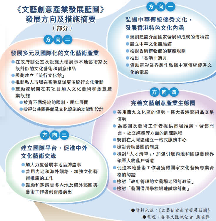 (香港文匯報記者 聶曉輝)香港特區政府籌備多時的《文藝創意產業發展藍圖》昨日出爐,提出四大發展方向(見表)、71項措施,為香港未來的文化藝術和創意產業發展訂立清晰願景、原則和發展方向,致力弘揚中華傳統優秀文化、發展多元及國際化的文化藝術產業等,將全面提升硬件質素,包括在北部都會區建立一所介紹國家發展和成就的博物館、在九龍公園設立中華文化體驗館,研究放寬不同場地的限制,例如容許工廈改建為小型劇場;又建議檢討現行「人才清單」完善文創人才庫的生態鏈,以及檢視藝團資助制度等。香港特區政府表示,會提速提效開展工作,並適時優化《藍圖》的措施,期望於2034年文化藝術和創意產業的增加價值達至2,000億元,就業人數增至26.4萬人,為拉動經濟發展提供源源不絕的動力。