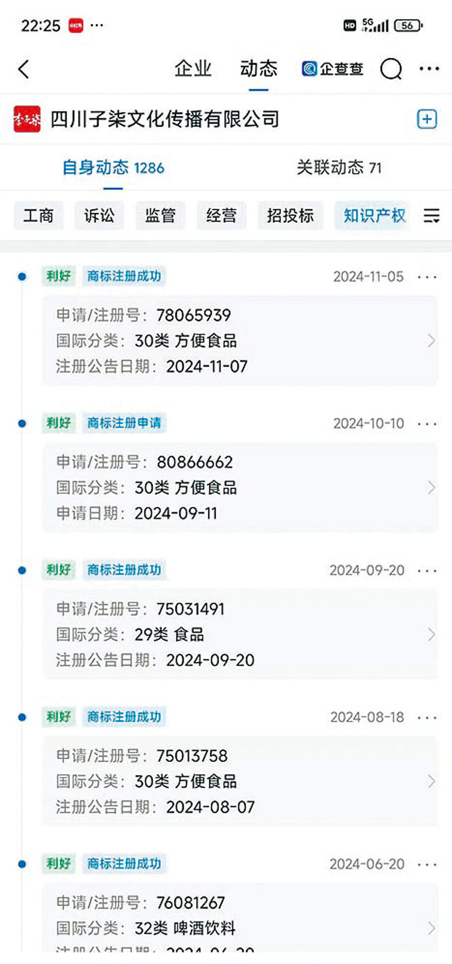 2021年10月李子柒與微念多次對簿公堂。在接受央視訪問時她強調想捍衛自己的品牌形象與價值:「李子柒這3個字,我是挺想保護它的,甚至我是不想讓它以後有太高的所謂的商業價值」。正如她所言,本次李子柒回歸網絡後,在品牌和IP的控制權方面動作頻頻。企業徵信平台App企查查數據顯示,李子柒所實控的四川子柒文化傳播有限公司(下稱子柒文化)於去年年底至今年9月期間,已申請註冊多個以「子柒」「李子柒」「李子柒 LIZIQI」為名的商標,涉及食品、方便食品、啤酒飲料、服裝鞋帽多個品類。
