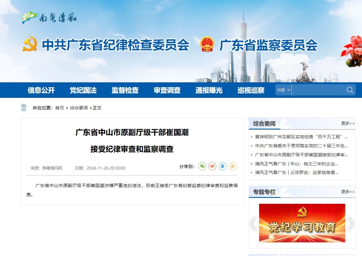 大公文匯全媒體報道,廣東省紀委監委昨晚(26日)發布消息,廣東省中山市原副廳級幹部崔國潮涉嫌嚴重違紀違法,目前正接受廣東省紀委監委紀律審查和監察調查。
