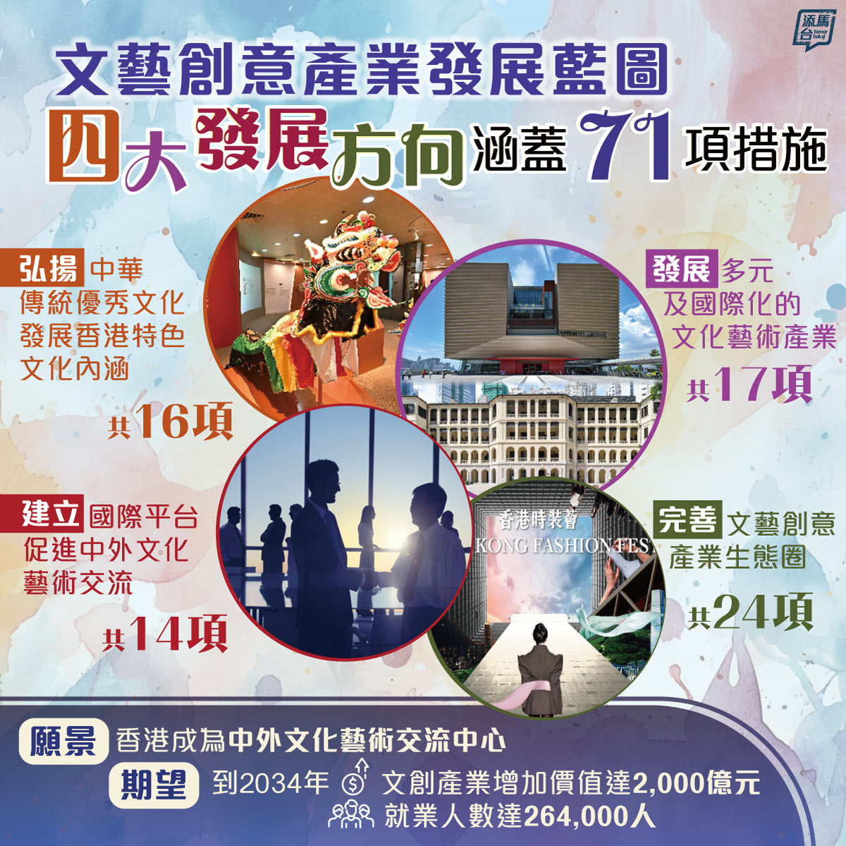 《藍圖》其中36項措施已經展開,而其餘措施均會於2025年起陸續推行,期望在2034年文化藝術和創意產業的增加價值會達至2,000億元,就業人數增加至264,000人。