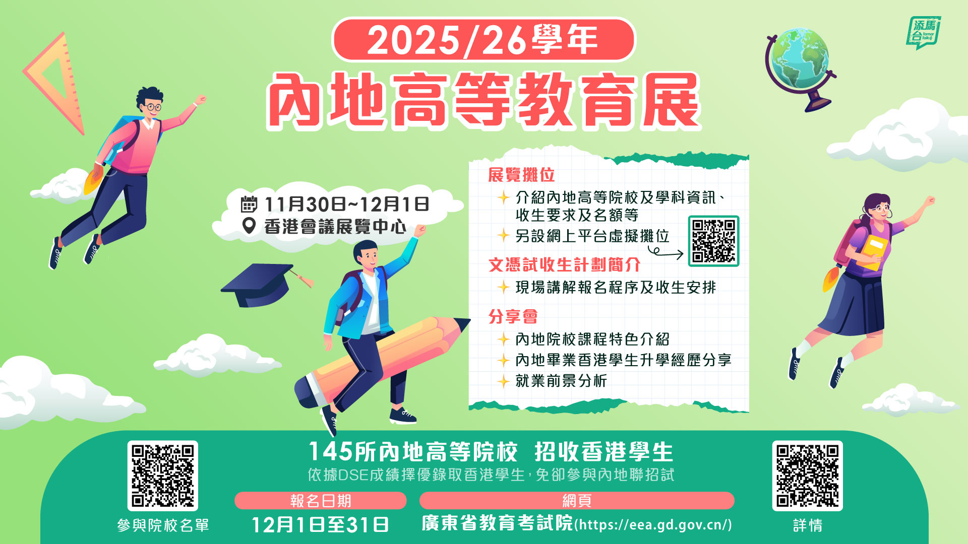 有意赴內地升學的學生及其家長注意!內地高等教育展將於本星期六及日(11月30日至12月1日)在香港會議展覽中心舉行,介紹2025/26學年內地高校招收香港中學文憑考試學生計劃各項安排及升學資訊,以及內地升學及就業前景。
