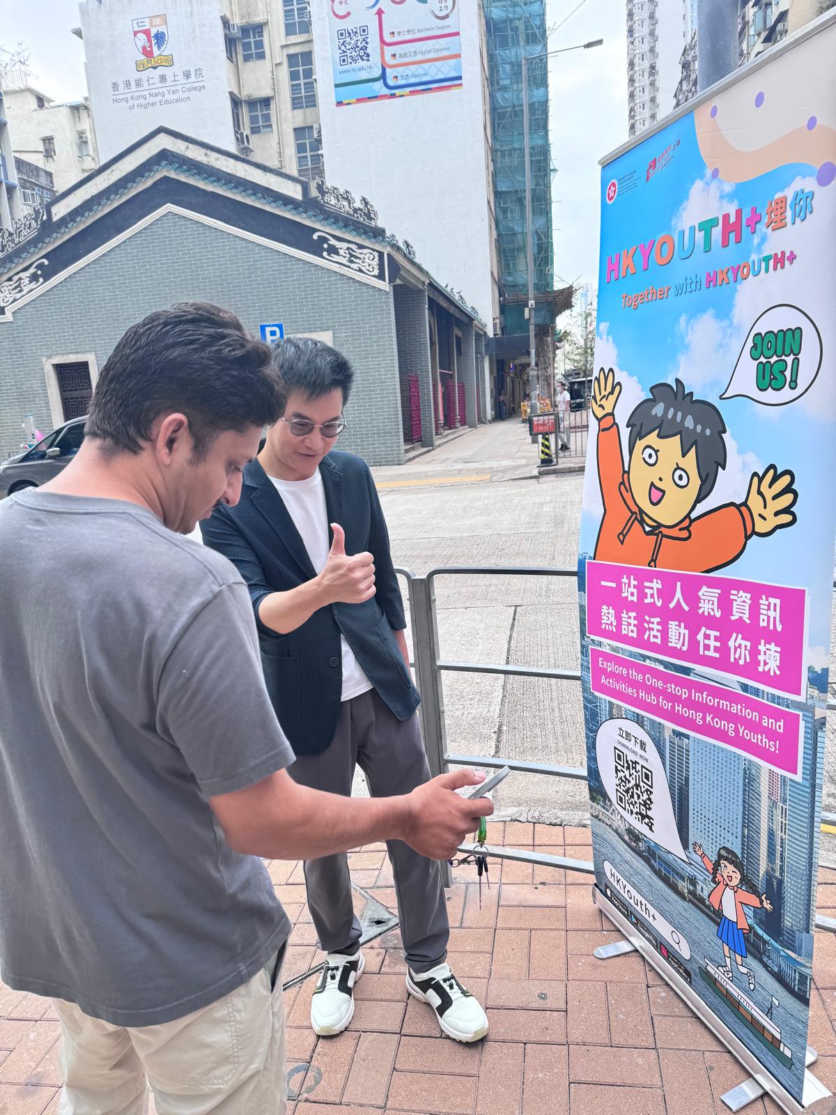 深水埗區一眾區議員都很賣力協助宣傳,他們在區內各處擺街站,向年輕人、街坊們介紹怎樣使用HKYouth+應用程式。很多學生、家長路過都停下腳步聽區議員介紹,還即時下載程式!也有不少街坊和市民即場用微信應用程式掃描二維碼,關注民青局的微信公眾號「香港民政及青年事務局」~