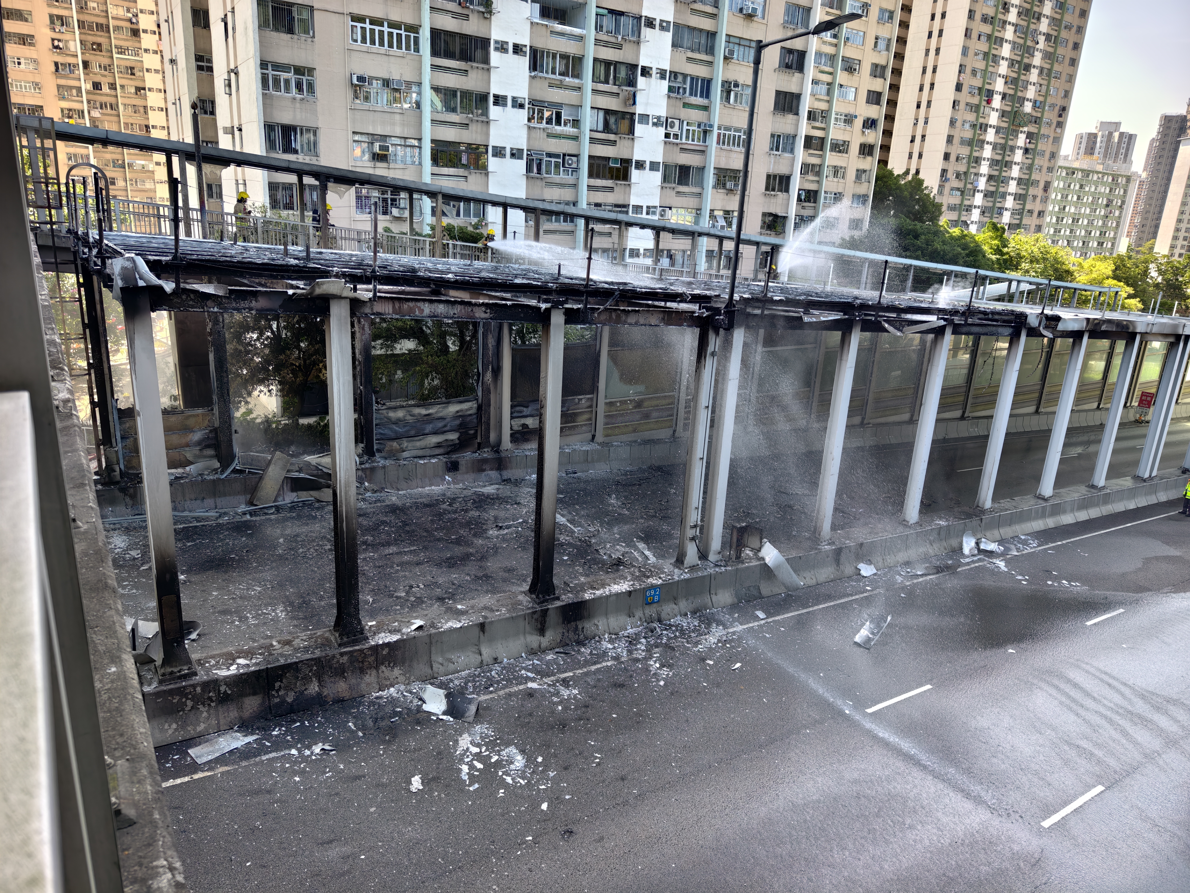 大公文匯全媒體記者前往現場,可見消防已將火救熄,逾20米長的隔音屏被燒毀,附近行人天橋亦遭波及,燈罩被熱熔。
