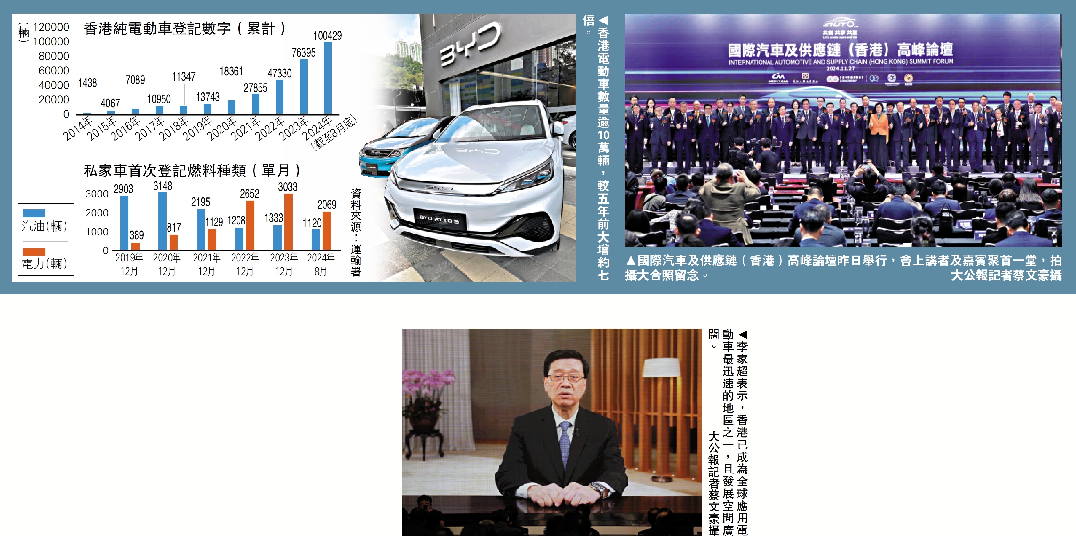 李家超昨日以視像形式在國際汽車及供應鏈(香港)高峰論壇致辭指出,截至去年11月,香港電動私家車佔整體私家車總數逾11%。目前,香港電動車數量逾10萬輛,較五年前大增約七倍,電動私家車佔香港新登記私家車的比例,亦由2022年的超過兩成增到現在約七成,增速位處世界前列。為進一步推動車輛的綠色轉型,新一份施政報告將預留約7.5億元,資助的士和專營巴士業界購買電動車輛,也將推出3億元新計劃,資助私營機構安裝高速充電設施,額外支援16萬輛電動車。