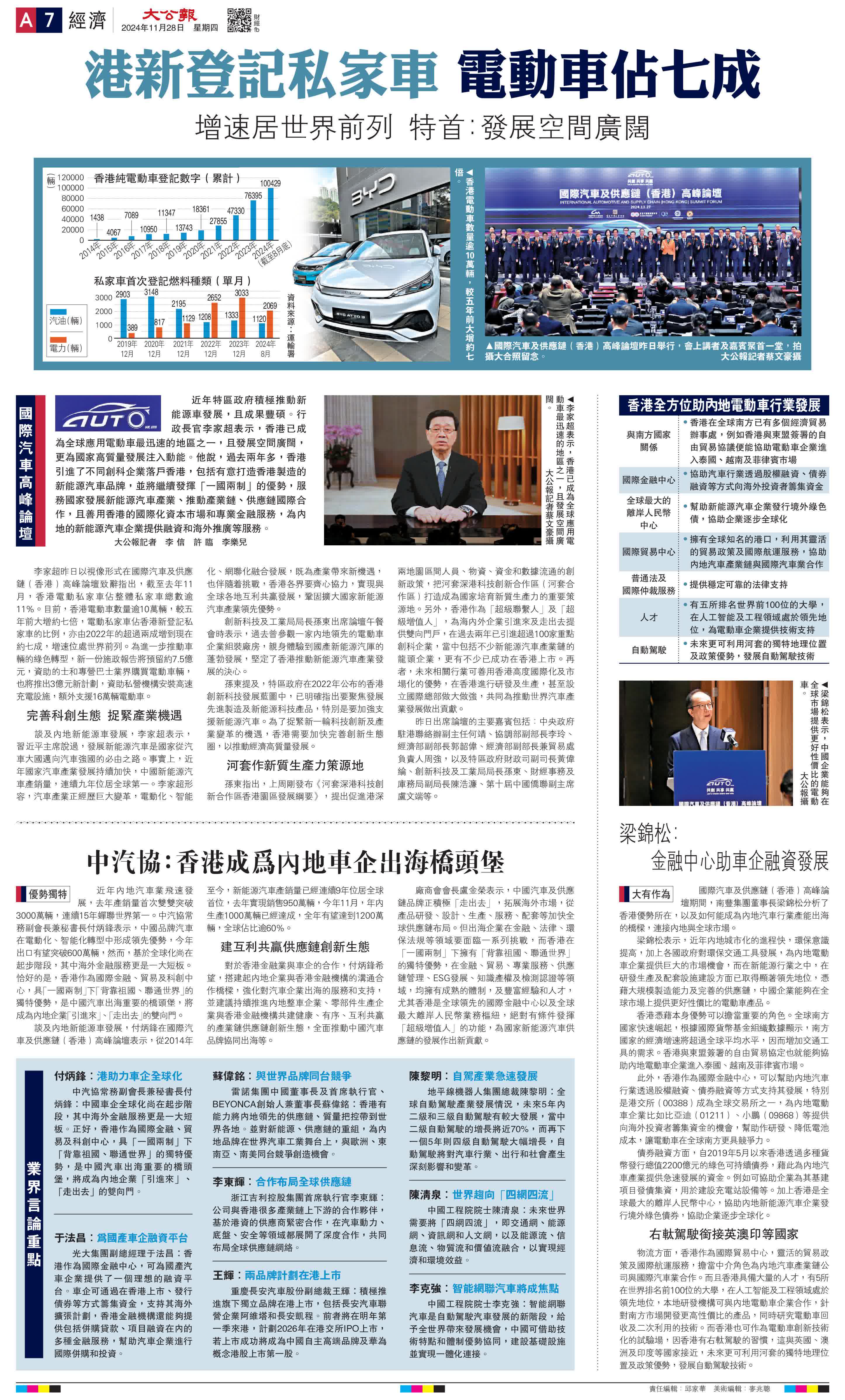 (大公報記者 李信 許臨 李樂兒)近年特區政府積極推動新能源車發展,且成果豐碩。行政長官李家超表示,香港已成為全球應用電動車最迅速的地區之一,且發展空間廣闊,更為國家高質量發展注入動能。他說,過去兩年多,香港引進了不同創科企業落戶香港,包括有意打造香港製造的新能源汽車品牌,並將繼續發揮「一國兩制」的優勢,服務國家發展新能源汽車產業、推動產業鏈、供應鏈國際合作,且善用香港的國際化資本市場和專業金融服務,為內地的新能源汽車企業提供融資和海外推廣等服務。