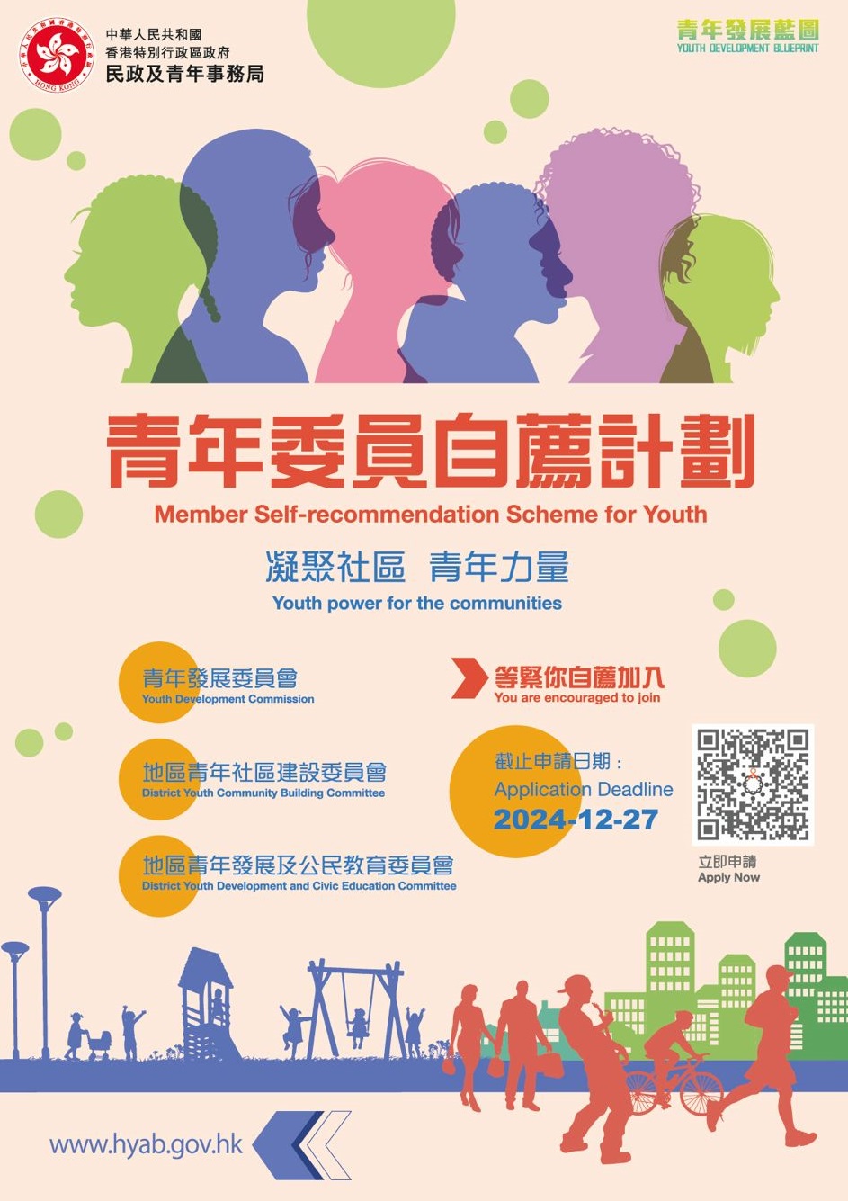 在截止申請日期當日(即2024年12月27日)年齡介乎16至35歲的青年人,符合資格申請「地區青年社區建設委員會」和「地區青年發展及公民教育委員會」。