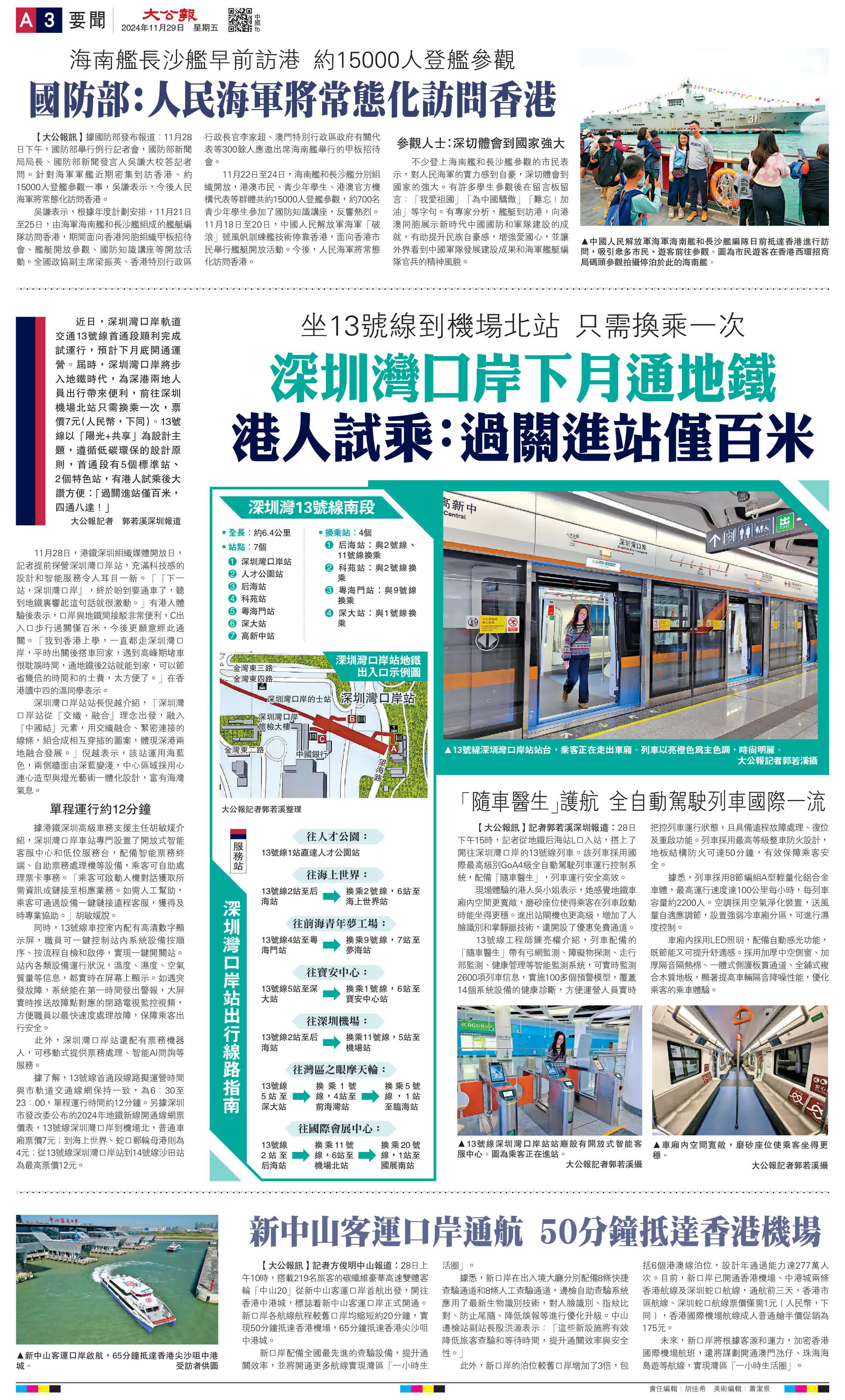 (大公報記者 郭若溪深圳報道)近日,深圳灣口岸軌道交通13號線首通段順利完成試運行,預計下月底開通運營。屆時,深圳灣口岸將步入地鐵時代,為深港兩地人員出行帶來便利,前往深圳機場北站只需換乘一次,票價7元(人民幣,下同)。13號線以「陽光+共享」為設計主題,遵循低碳環保的設計原則,首通段有5個標準站、2個特色站,有港人試乘後大讚方便:「過關進站僅百米,四通八達!」
